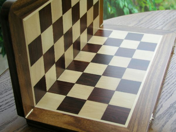 ChessBaron is proud to offer a folding board that looks like a luxury board, but can conveniently be taken along for that ‘game on the go’. This board is made of solid sheesham wood – not veneer. Made with the finest materials and treated for moisture control with a high gloss finish for protection from the elements. The high quality of these boards is beyond compare. These are the best folding boards we’ve seen and can be selected to partner with our economy chess pieces all the way up to our luxury pieces. Care for a game of chess at the park?!