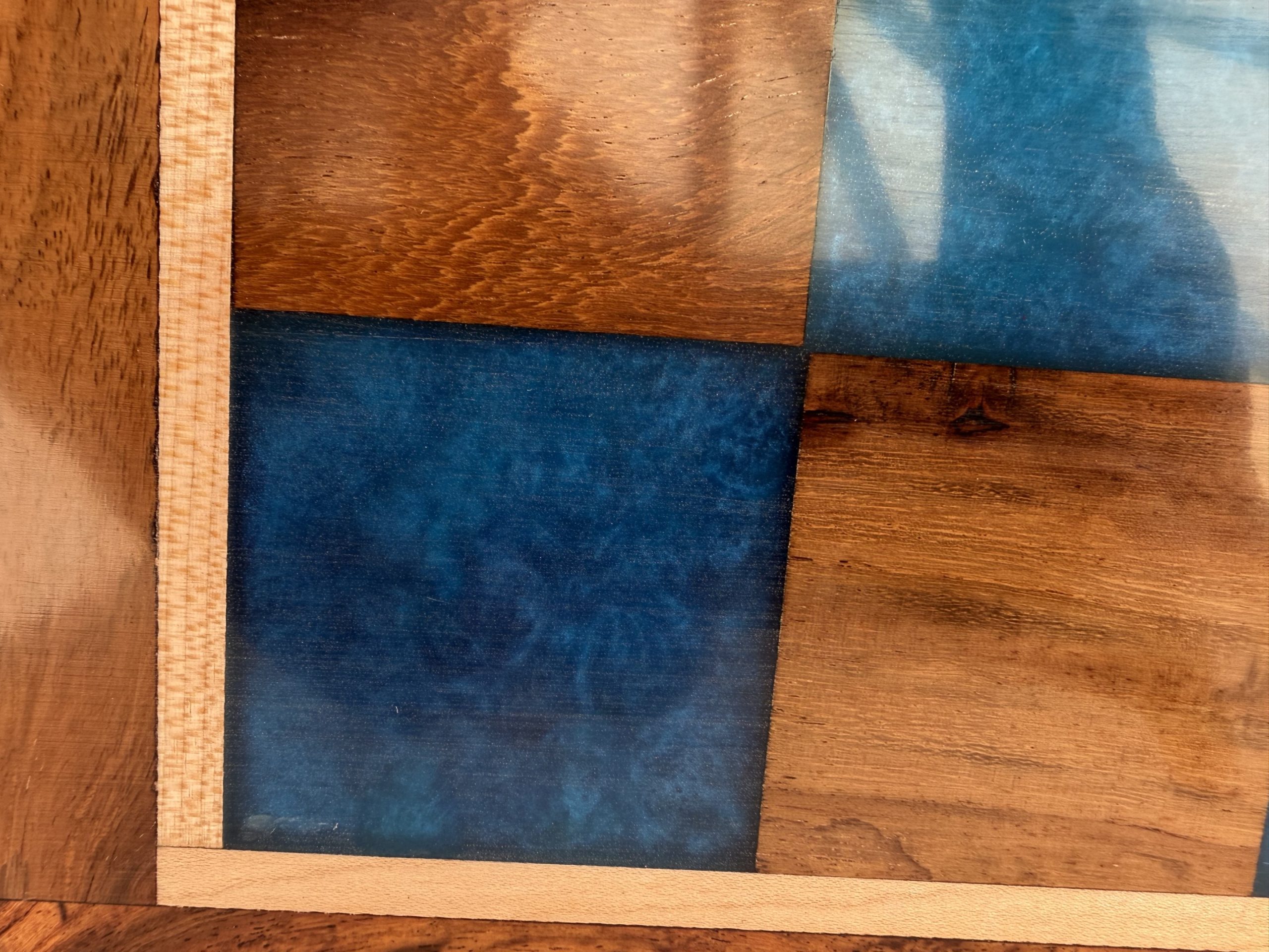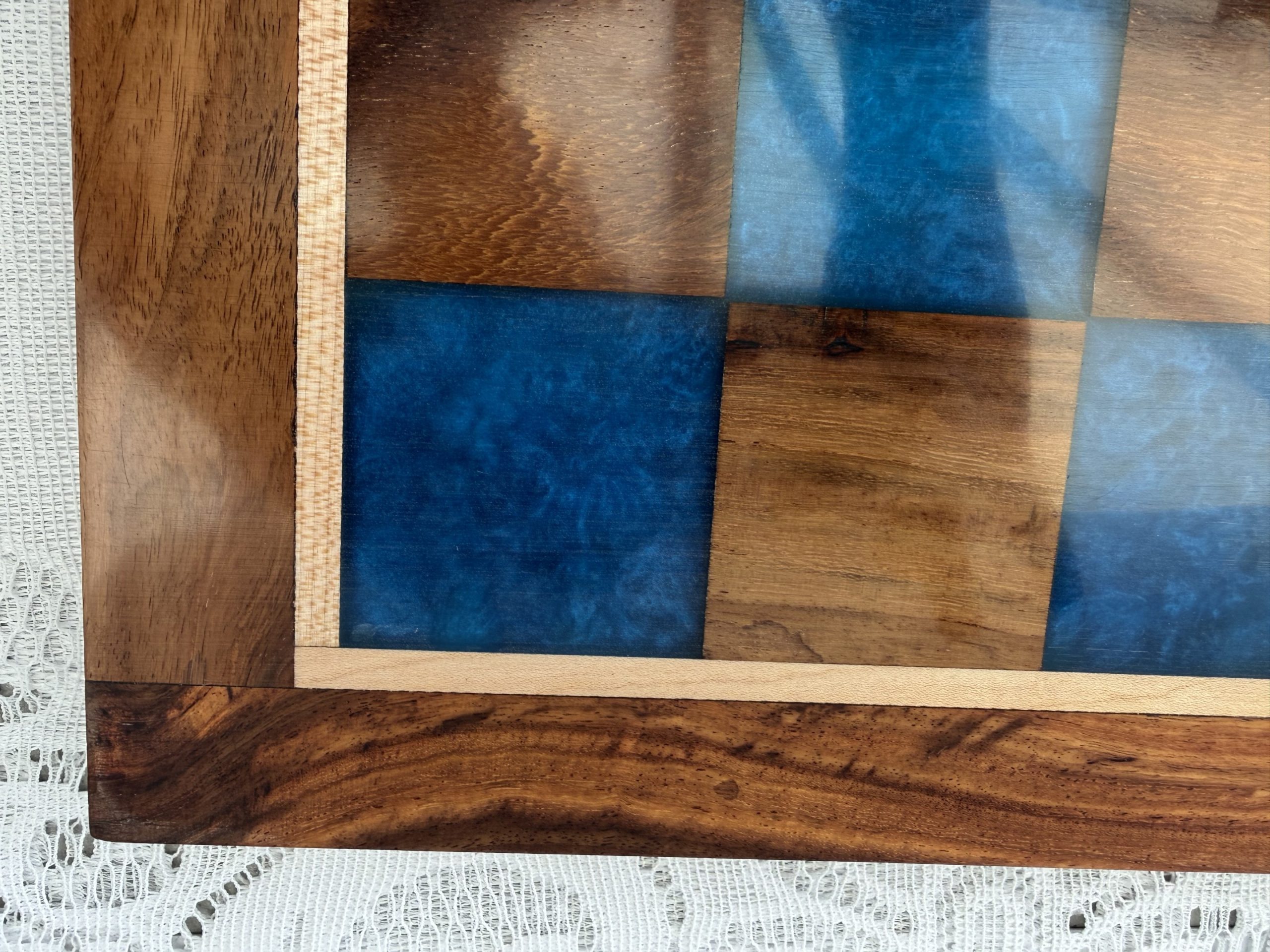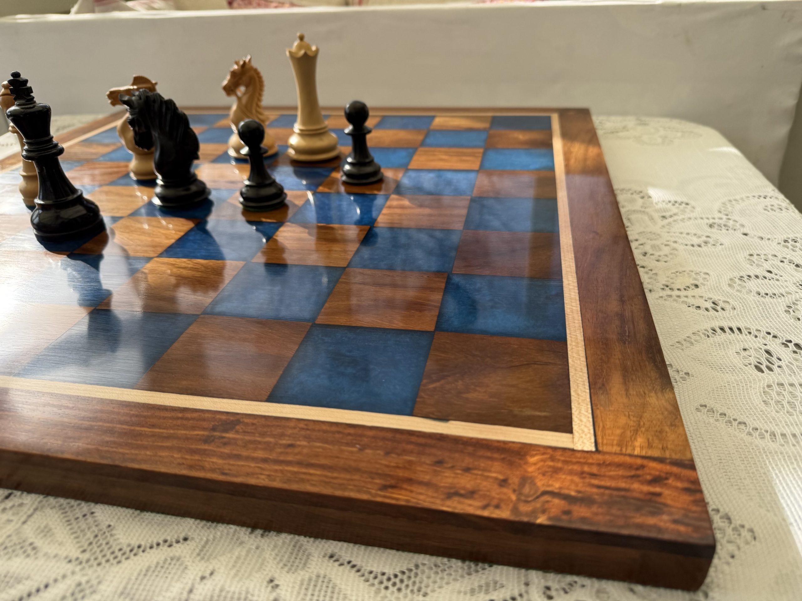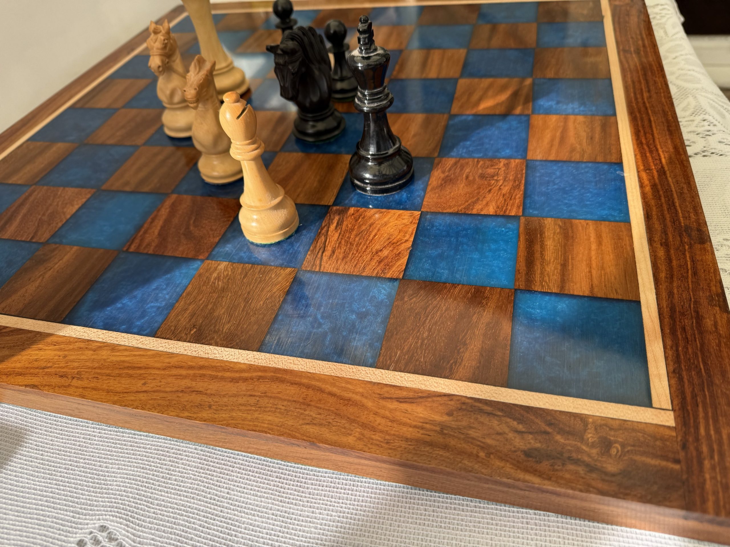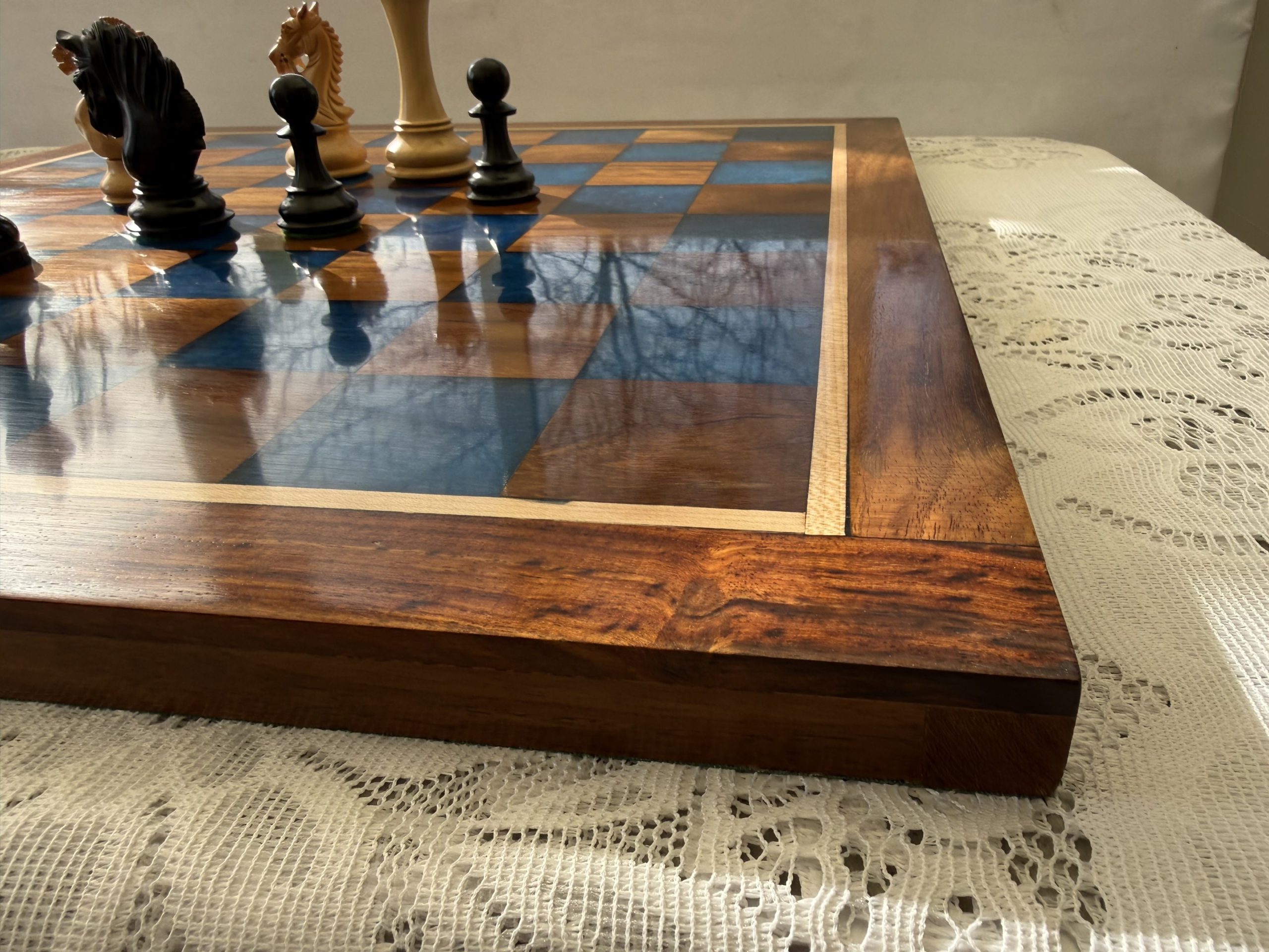 There are chess boards that simply hold the pieces — and there are boards that set the stage. The Blue Obsidian Swirl & Walnut Chess Board belongs firmly to the latter.
