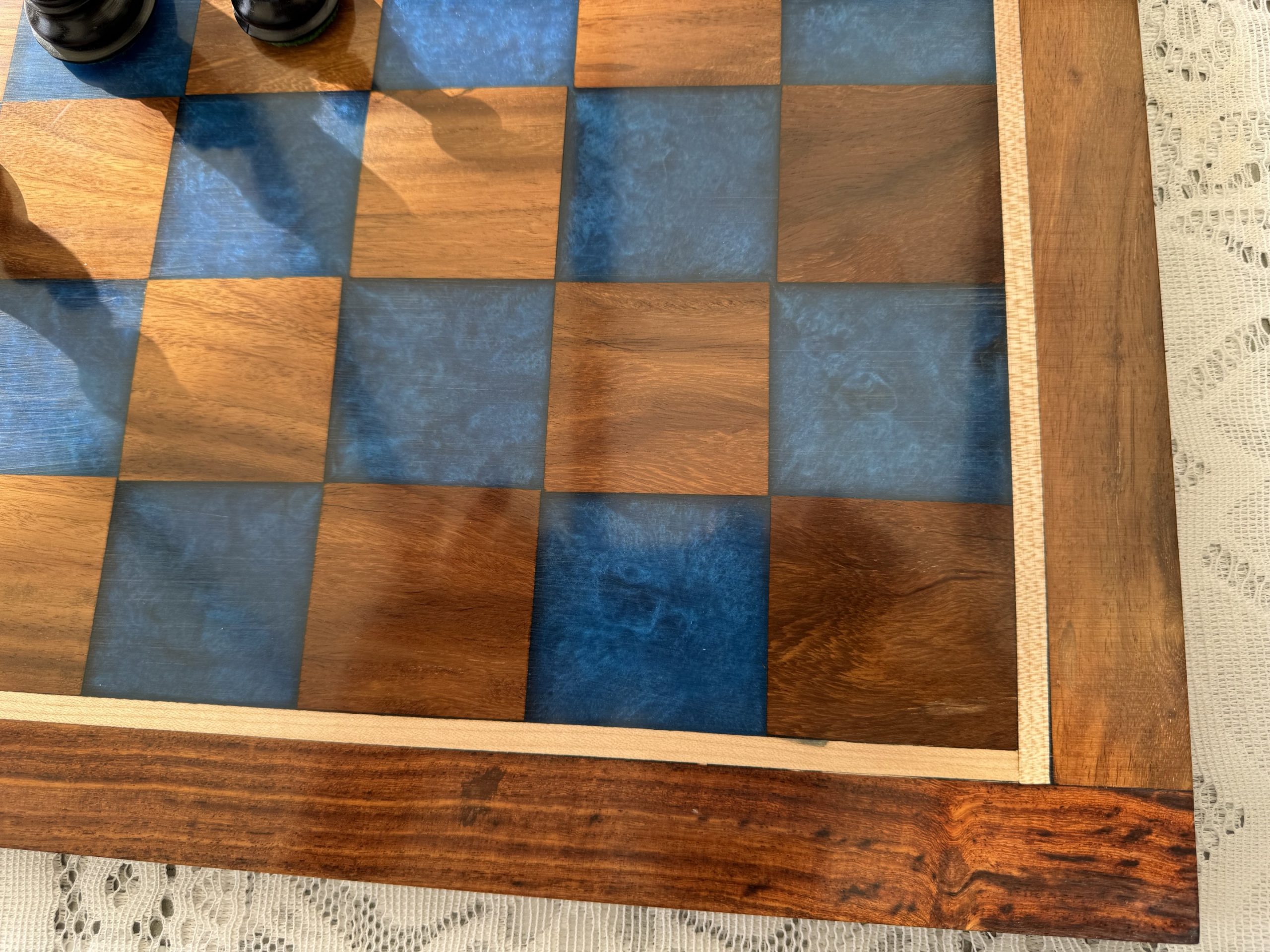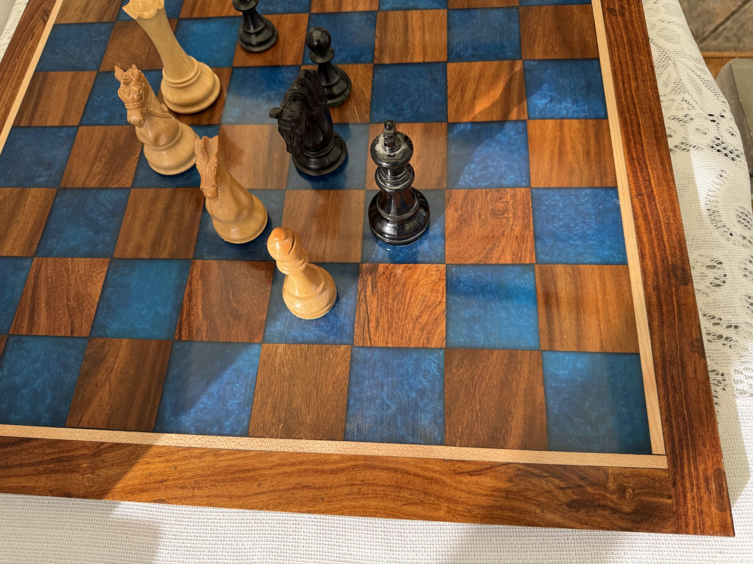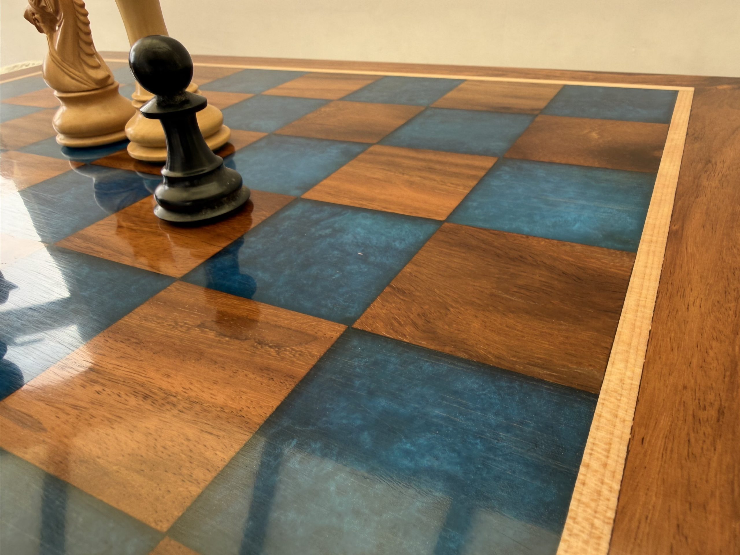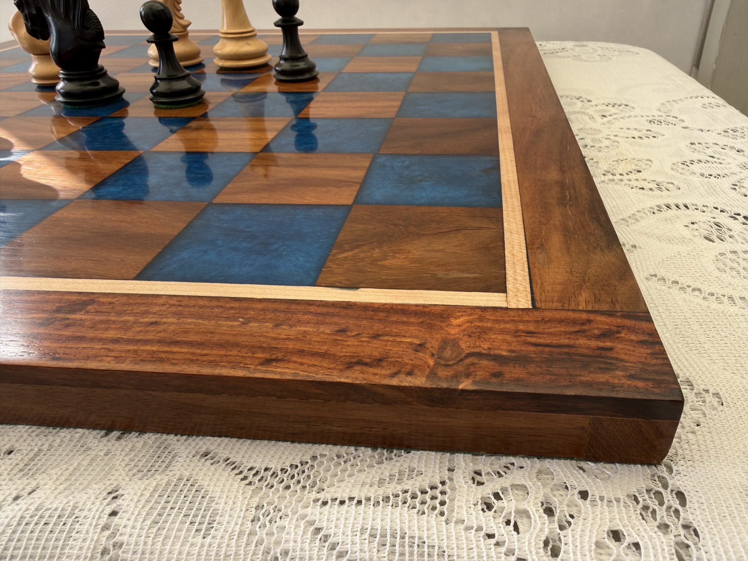 This is a board that pairs beautifully with both classic ebony sets and lighter natural woods. It particularly rewards well-carved knights — the darker field providing a theatrical backdrop that makes sculptural detail stand out.