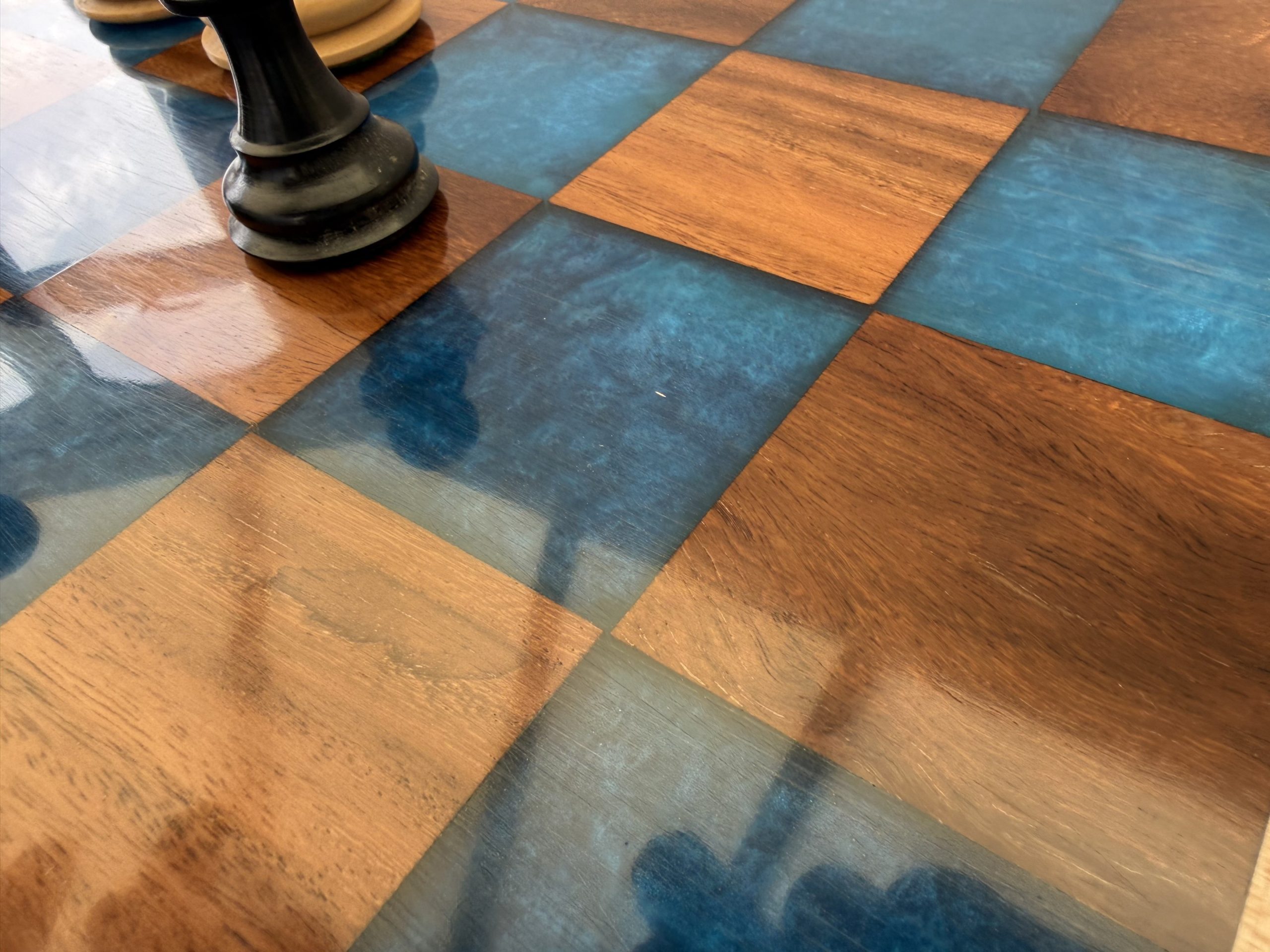 Its dark squares are not flat Blue but alive with subtle marbling — a deep obsidian surface with gentle, swirling movement that shifts under the light. The effect is almost stone-like, reminiscent of polished volcanic glass. It brings depth, character, and a sense of quiet drama to the board.