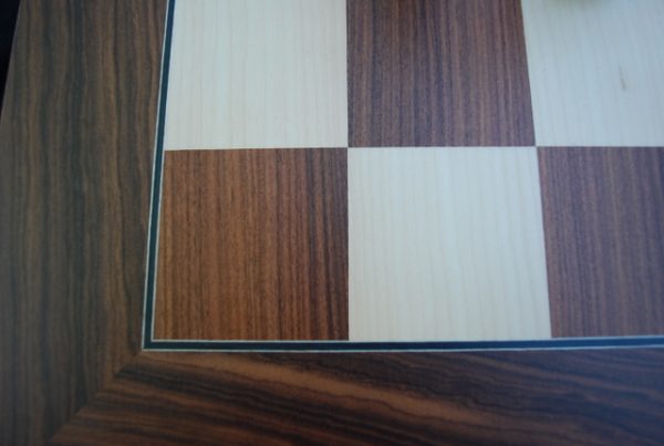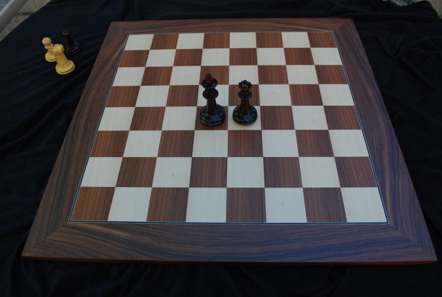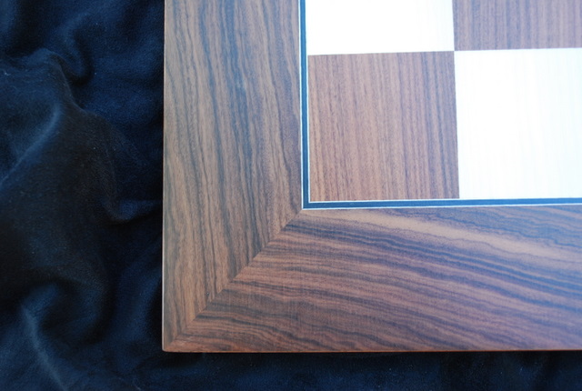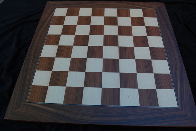 Maple and Santos Palisander chess board with border. Only high quality products are used in these chess boards to beautify and protect the wood, giving a smooth mat touch to the board and protecting players from light reflection. The crafting skill applied is the same used in producing fine wood furniture. The playing side as well as the rear of the board are made with high quality veneers and very special finishing. The wood appears natural and pleasing to the eye. Square size 2.125 inches.