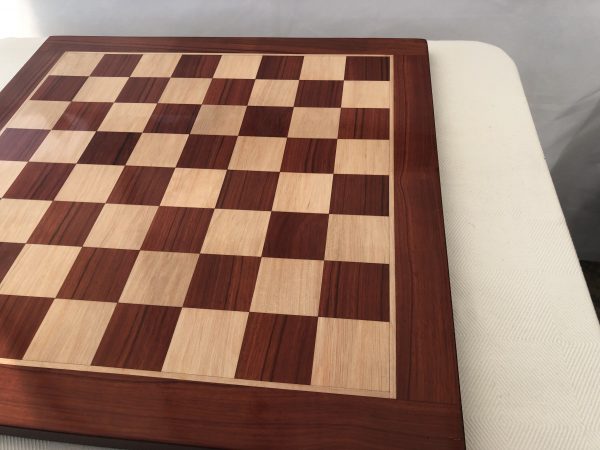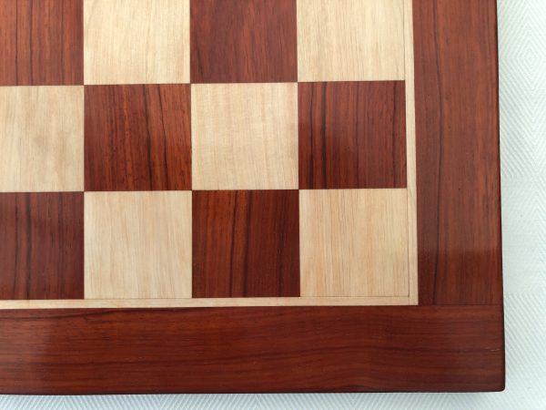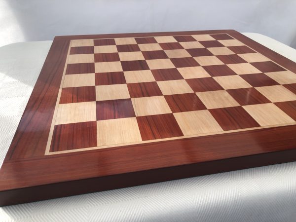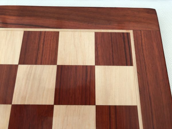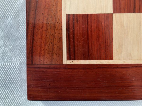 The traditional square edge and square corner Bud Rosewood, or Redwood version of the luxury chess board section is colored in such a way as to really complement the darker shades of pieces. It’s quite red in appearance. When we first saw this we were shocked by the obvious redness – but the board coloring grew on us so much that we now regard this as the classic excellent board in our inventory as long as your pieces are correspondingly dark. It’s simply oustanding. The finish is such that it hosts luxury chess sets splendidly. The weight of the board is quite significant – over 4kg. This model has squares of just over 2 inches.