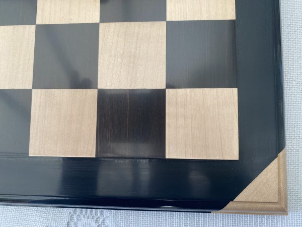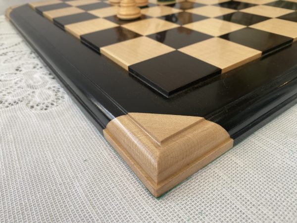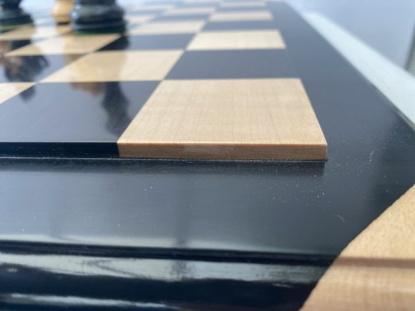 2.2″ Squares and width of 21″. An amazing square cornered contrasting wood chess board suitable for any luxury set. It is heavy solid Grade One Ebony, the Best Ebony available and the appearance is just wonderful. The board provides a robust playing surface to cope with accidents, knocks and will service generations to come. The board is very heavy, over 4kg. The squares on the chess board are 2.2″. At ChessBaron we have never come across a better quality chess board than this example – chess boards like this will do justice to any set. Most wood products these days are veneer – this is NOT veneer, it’s NOT made in China and is NOT automated or mass produced in any way. It represents quality that our Grandparents enjoyed and expected, rather than what’s generally available. Our uniqueness in wood products is maintained by refusing to go down the route of more cheaply made boards that are made and imported by merchants whose eyes only light up with the ch’ching of a cash register. ChessBaron has enduring integrity that our own Grandchildren will respect and inherit from us.
