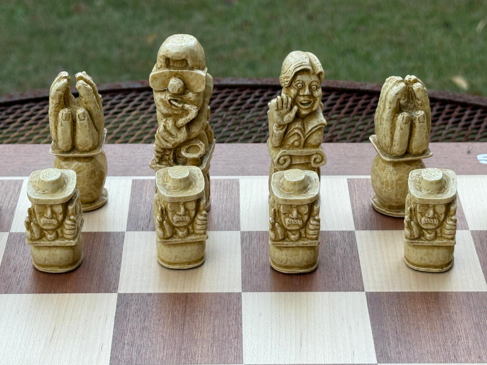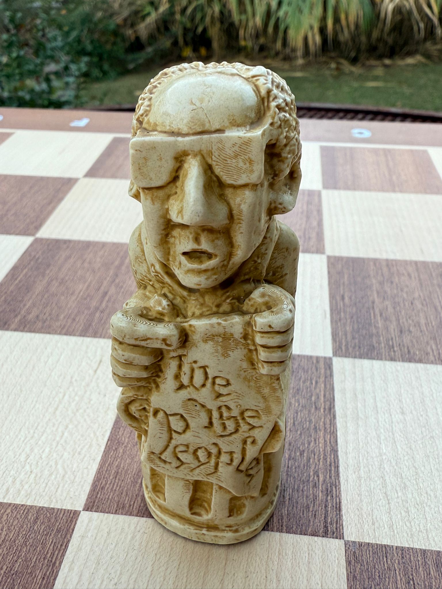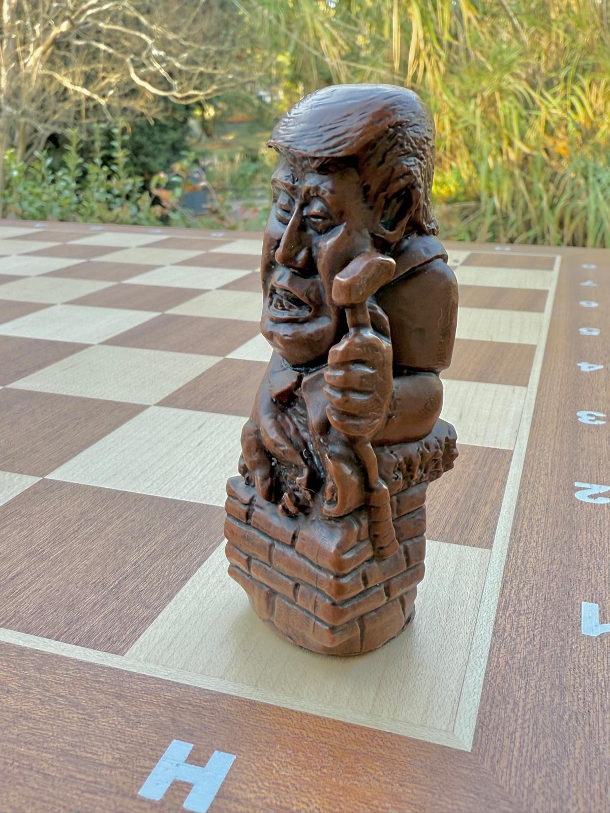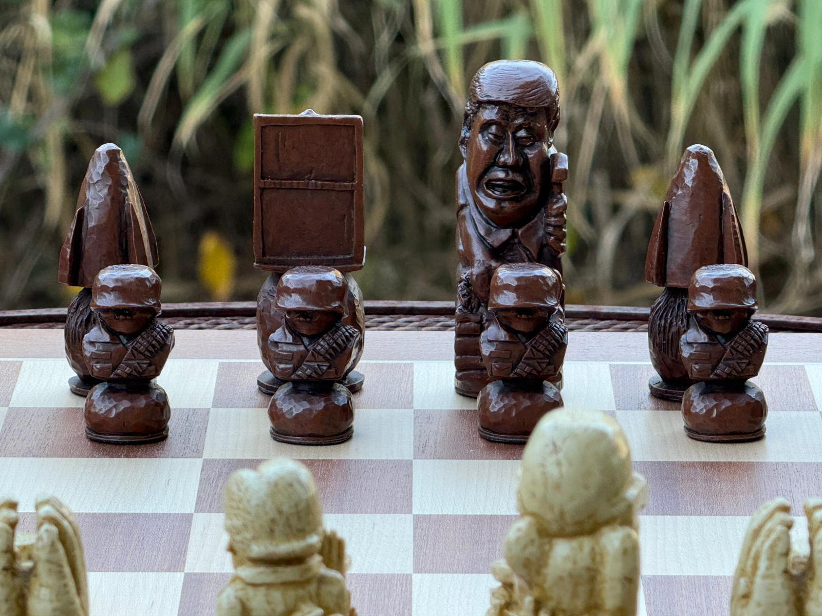 A set of stone and resin chess pieces depicting key US political characters, namely Mr Trump, Mr Clinton and Mrs Clinton, along with key supporting objects as described below. The set also has Bernie Sanders as an extra/alternative white King – it’s supplied by default.