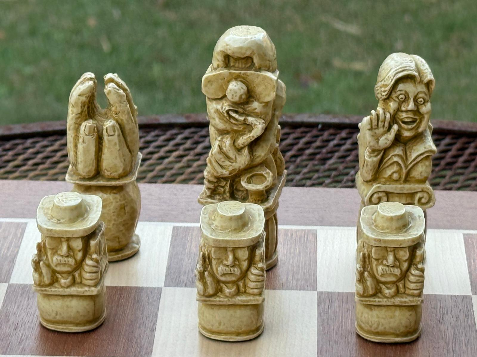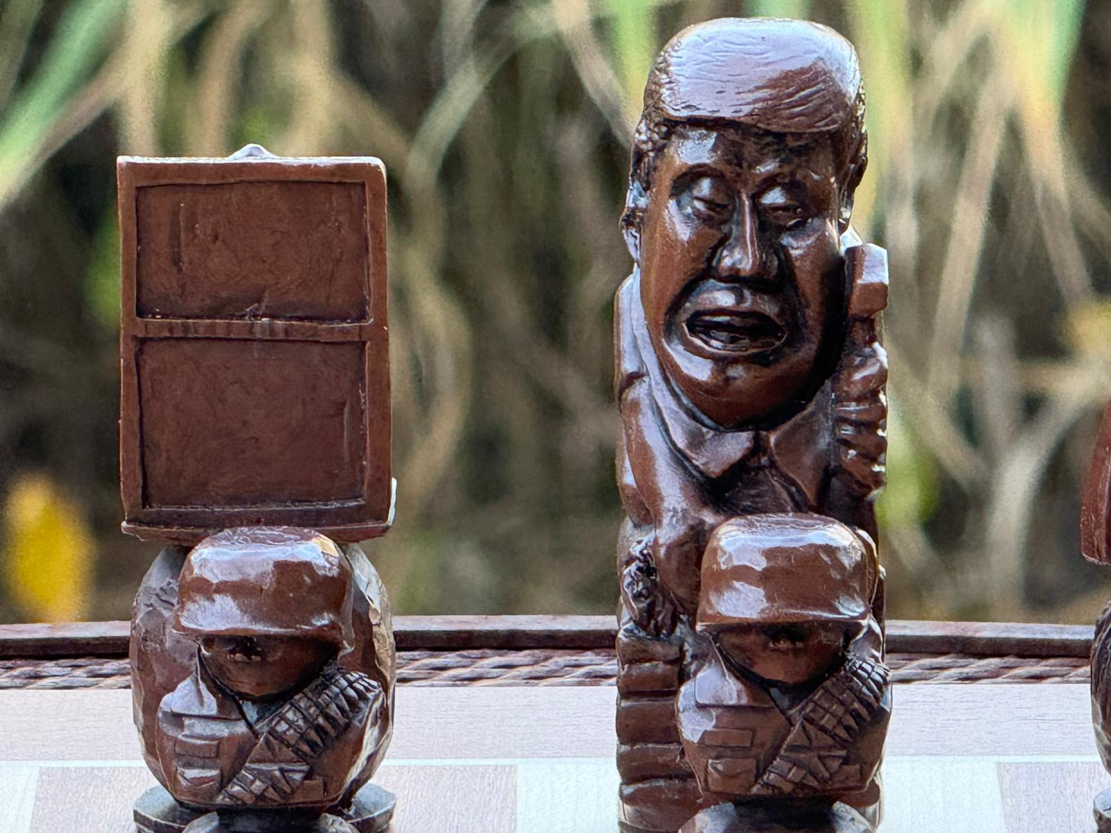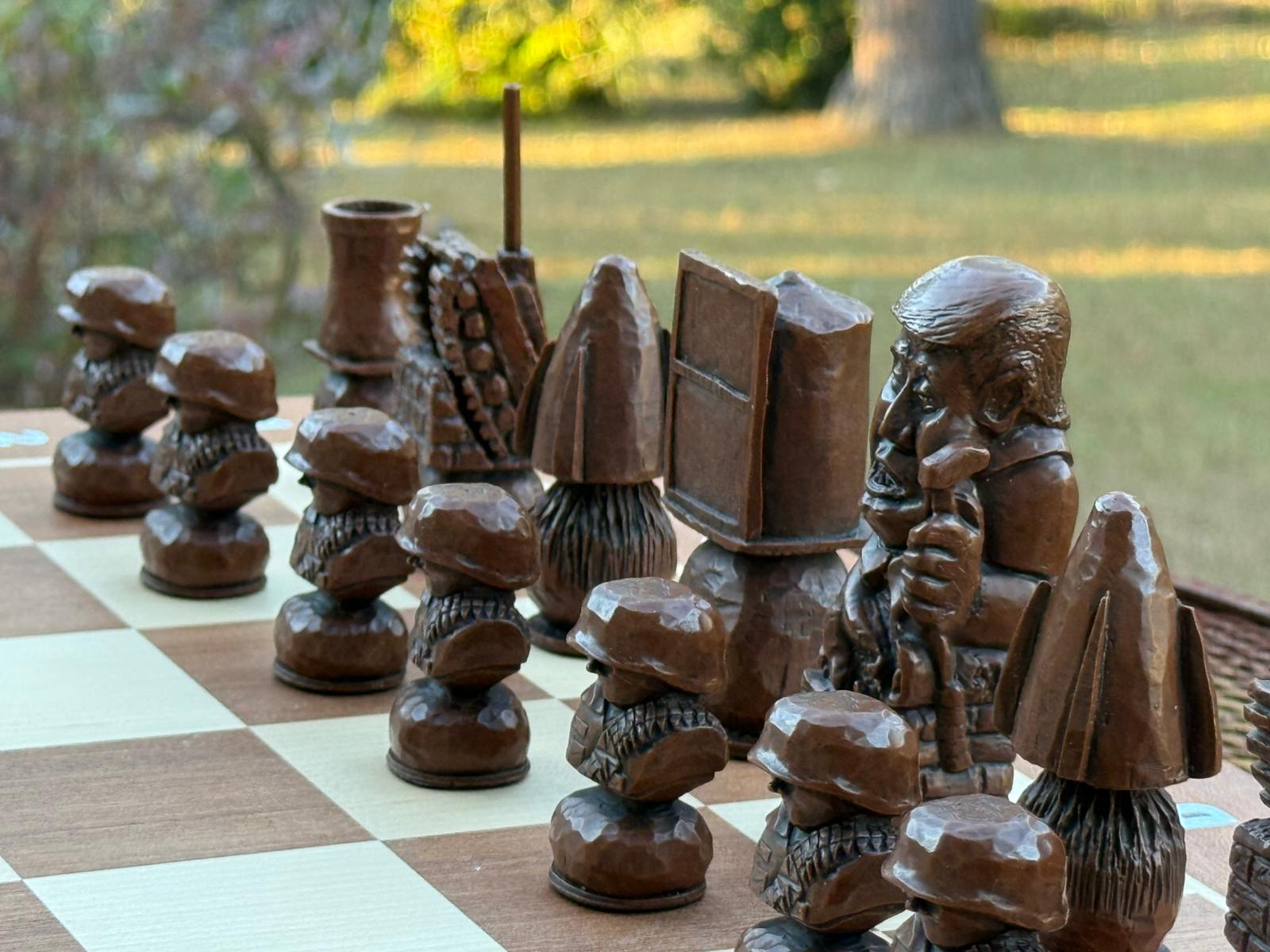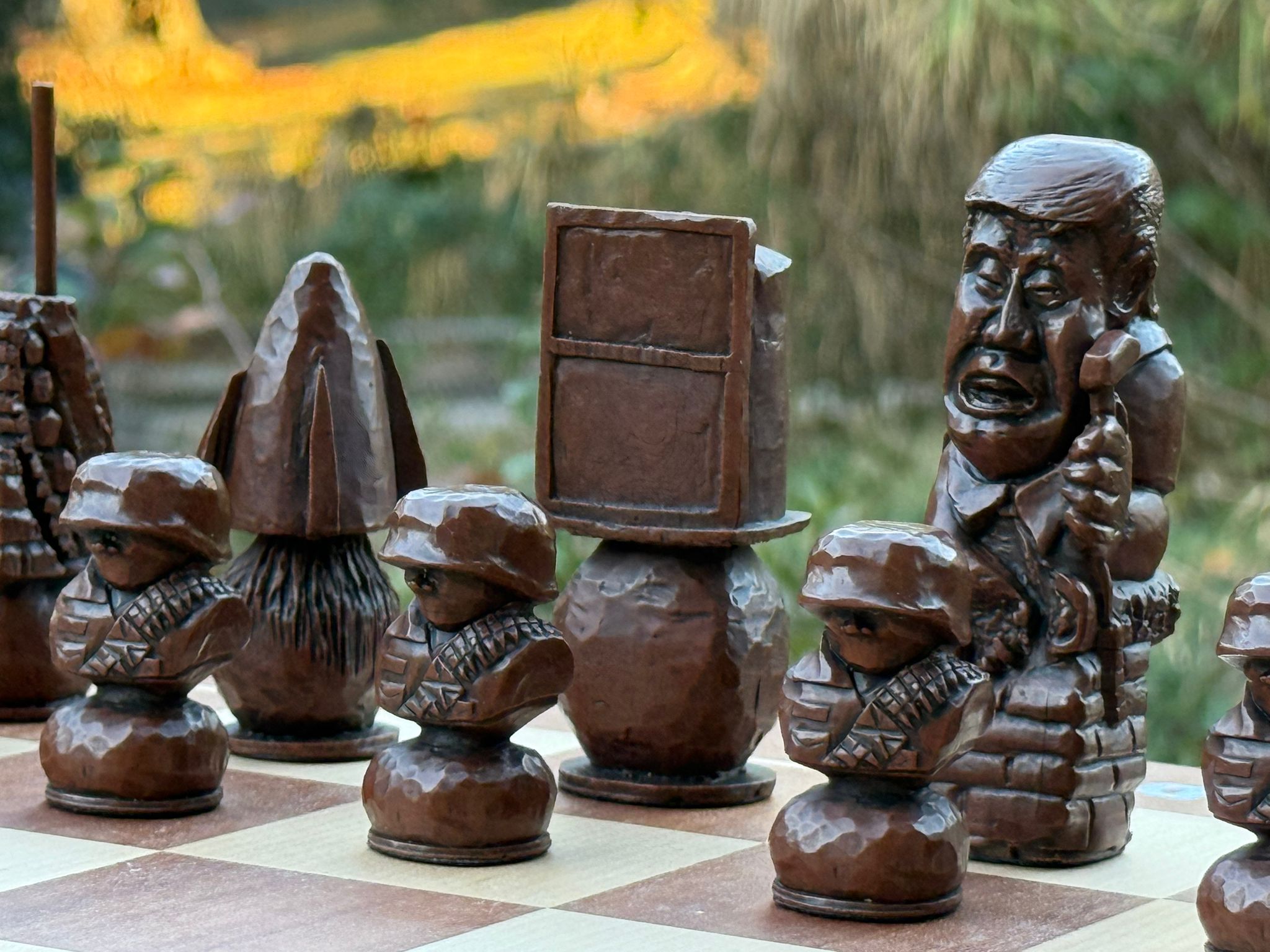 A set of stone and resin chess pieces depicting key US political characters, namely Mr Trump, Mr Clinton and Mrs Clinton, along with key supporting objects as described below. The set also has Bernie Sanders as an extra/alternative white King – it’s supplied by default.