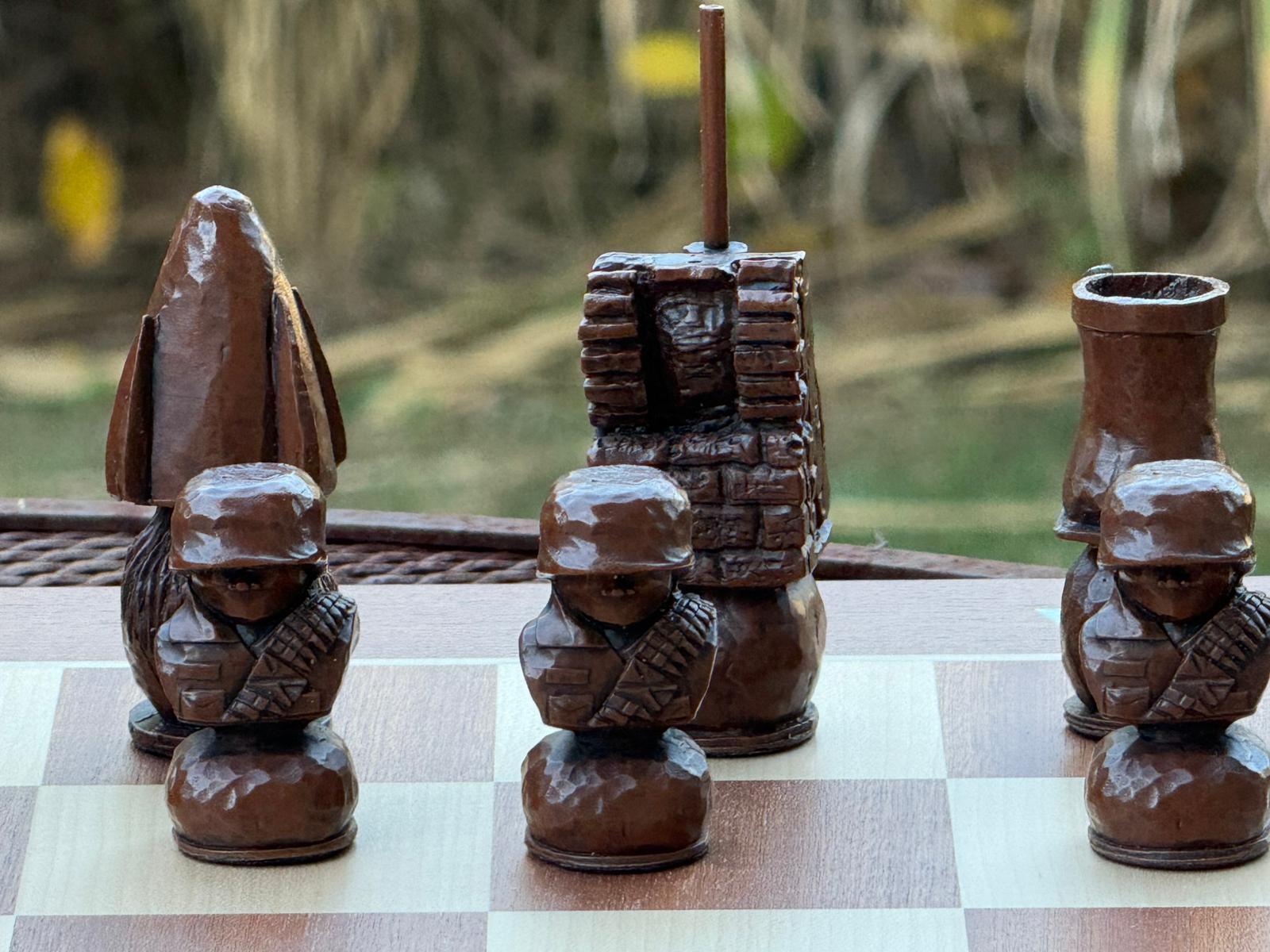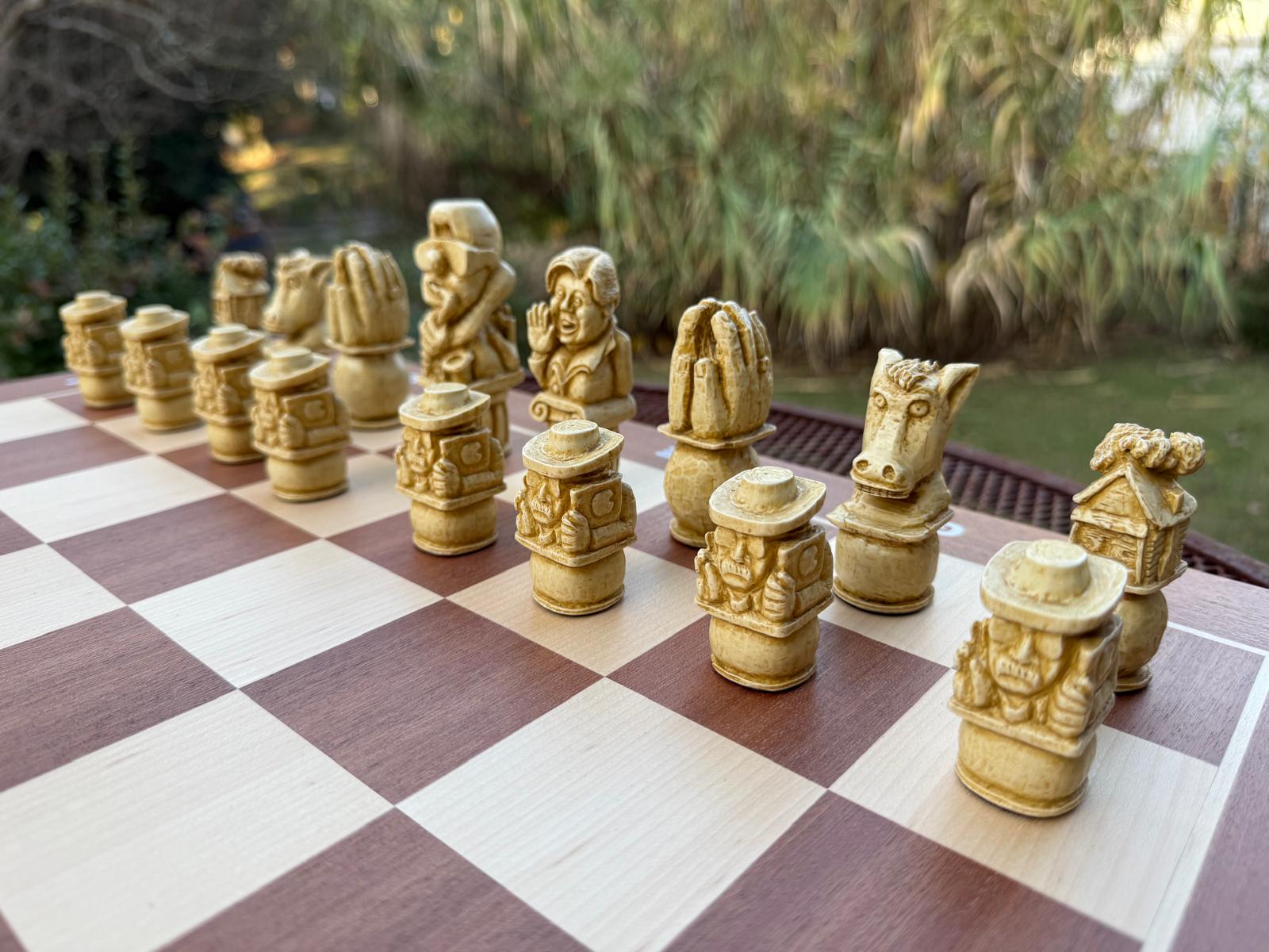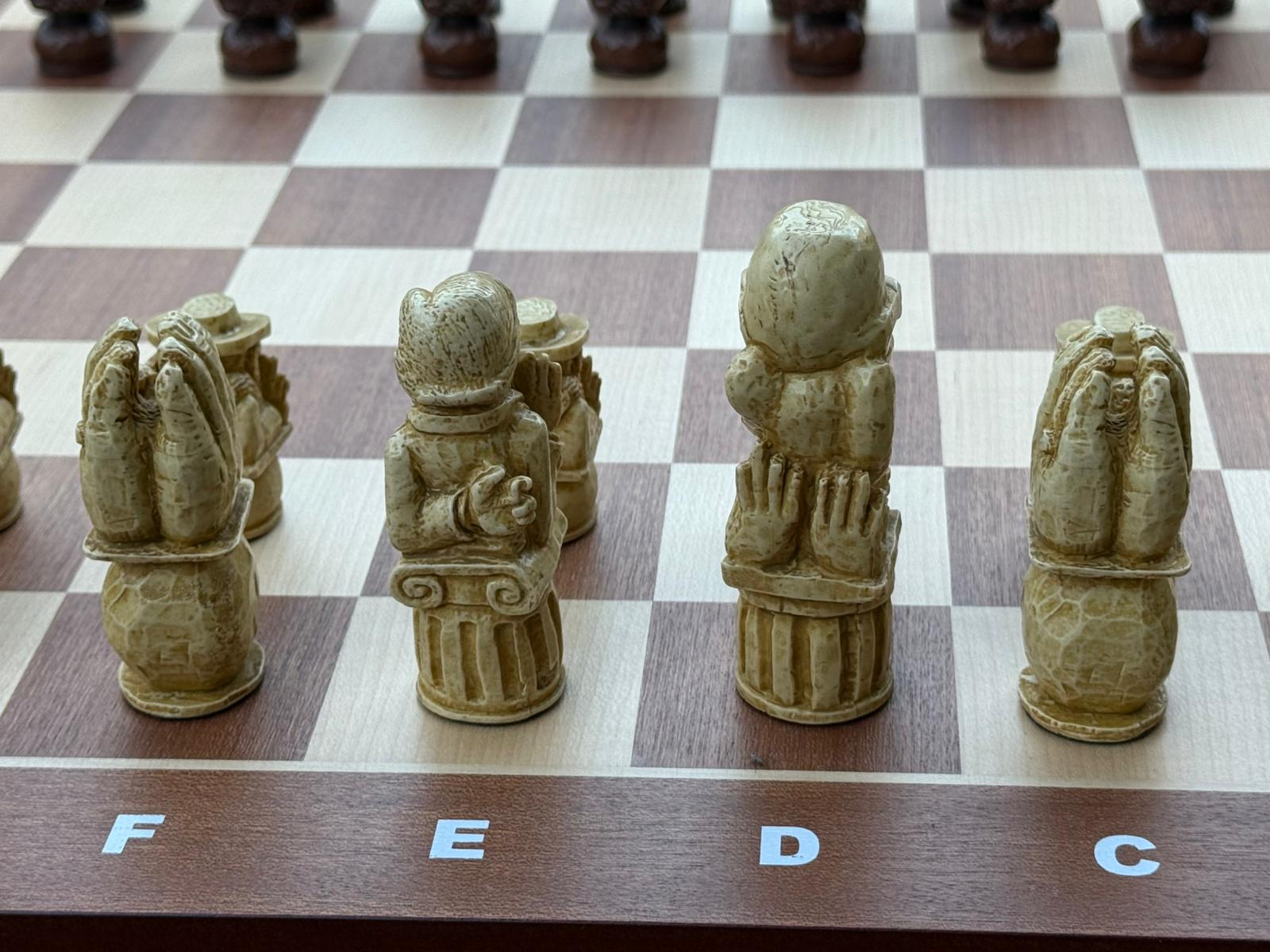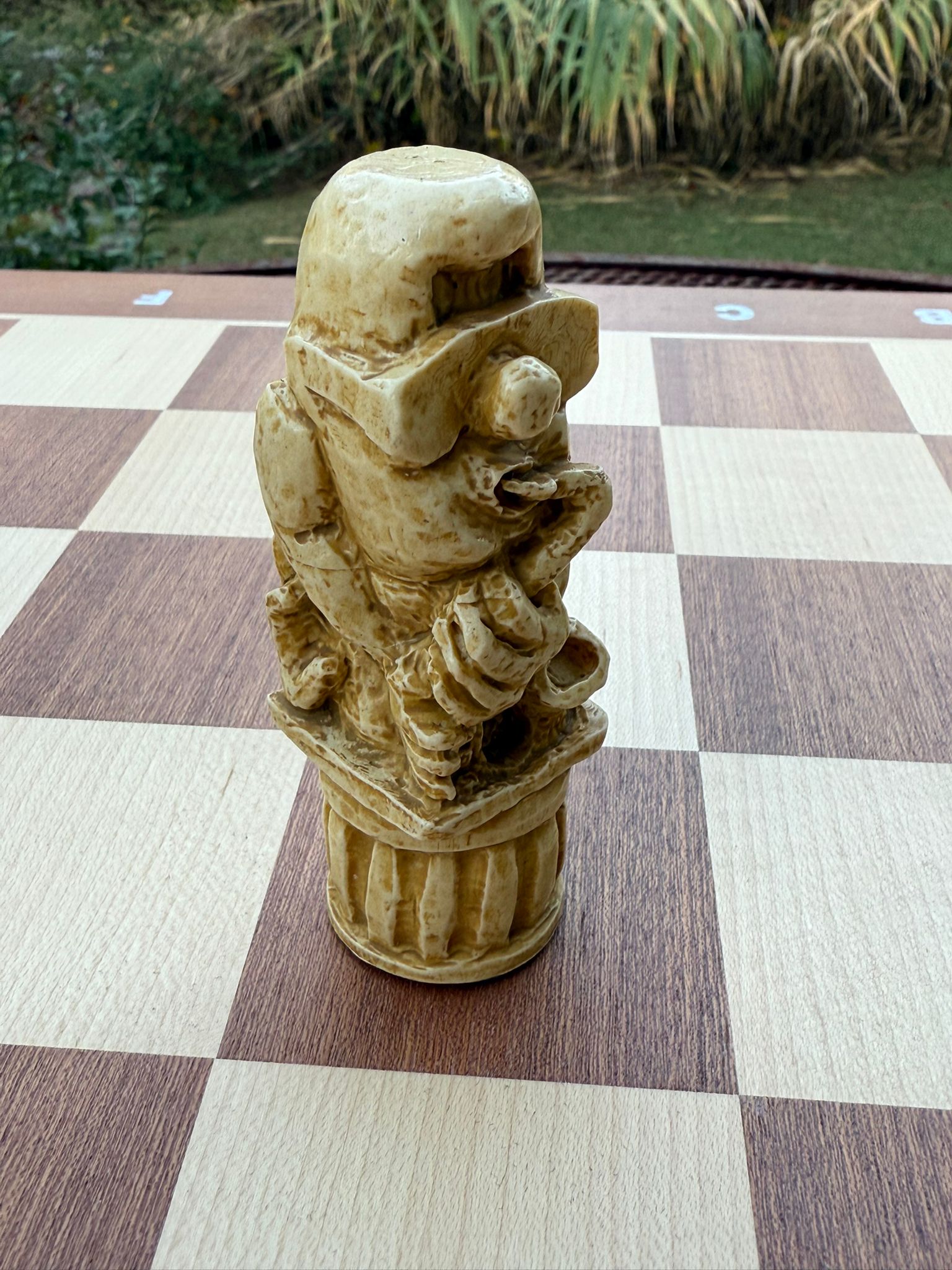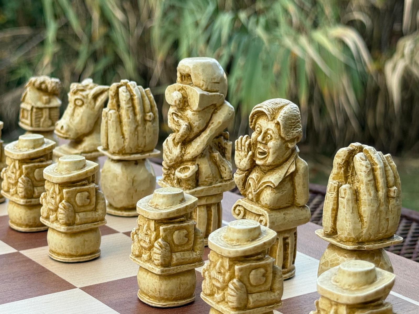 A set of stone and resin chess pieces depicting key US political characters, namely Mr Trump, Mr Clinton and Mrs Clinton, along with key supporting objects as described below. The set also has Bernie Sanders as an extra/alternative white King – it’s supplied by default.