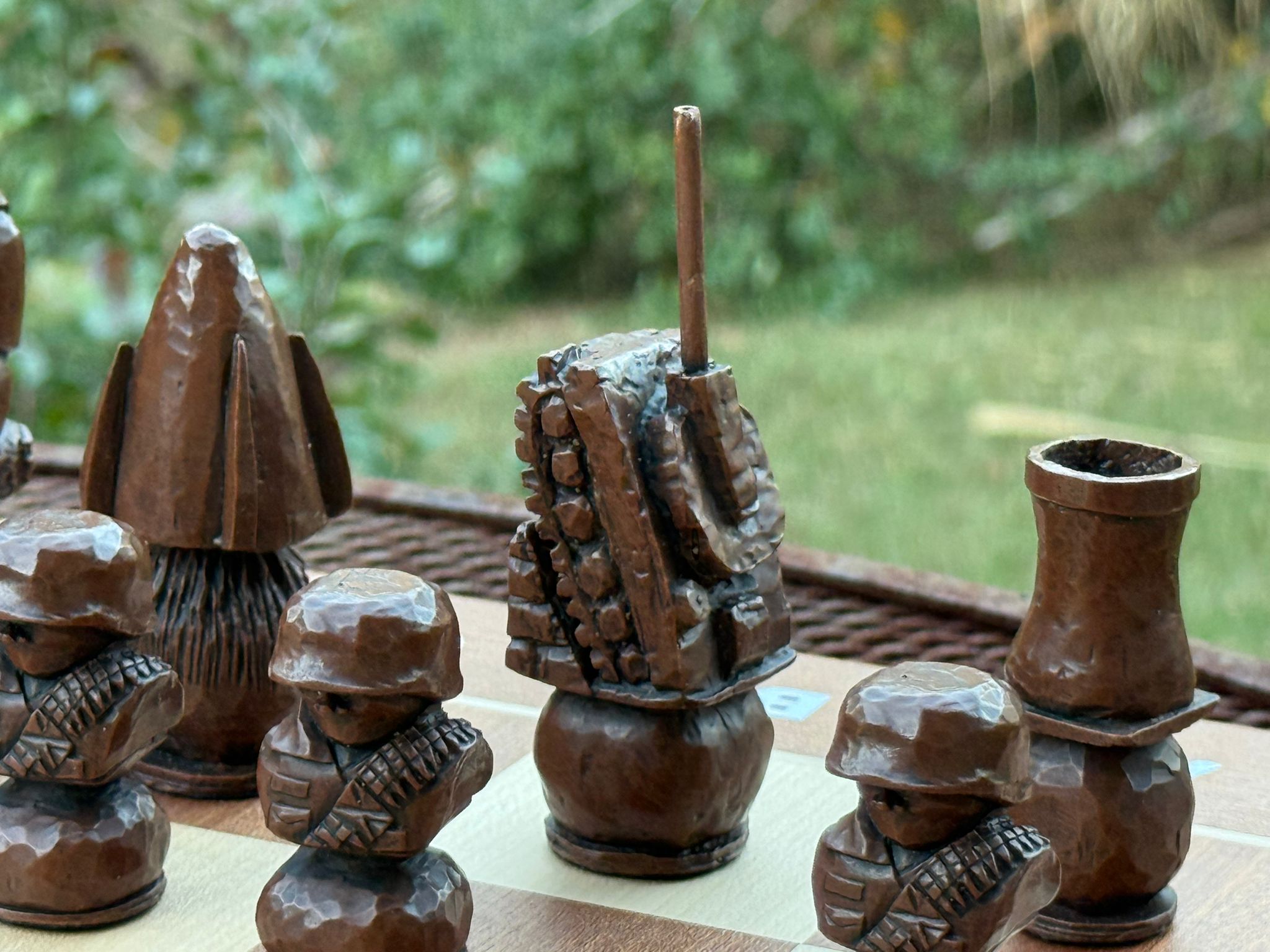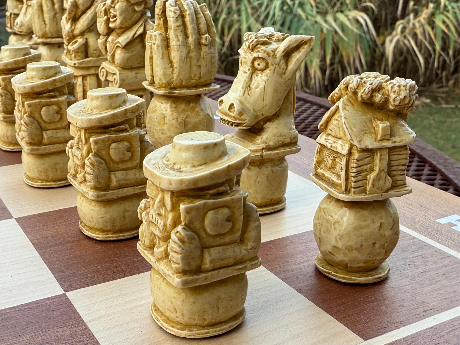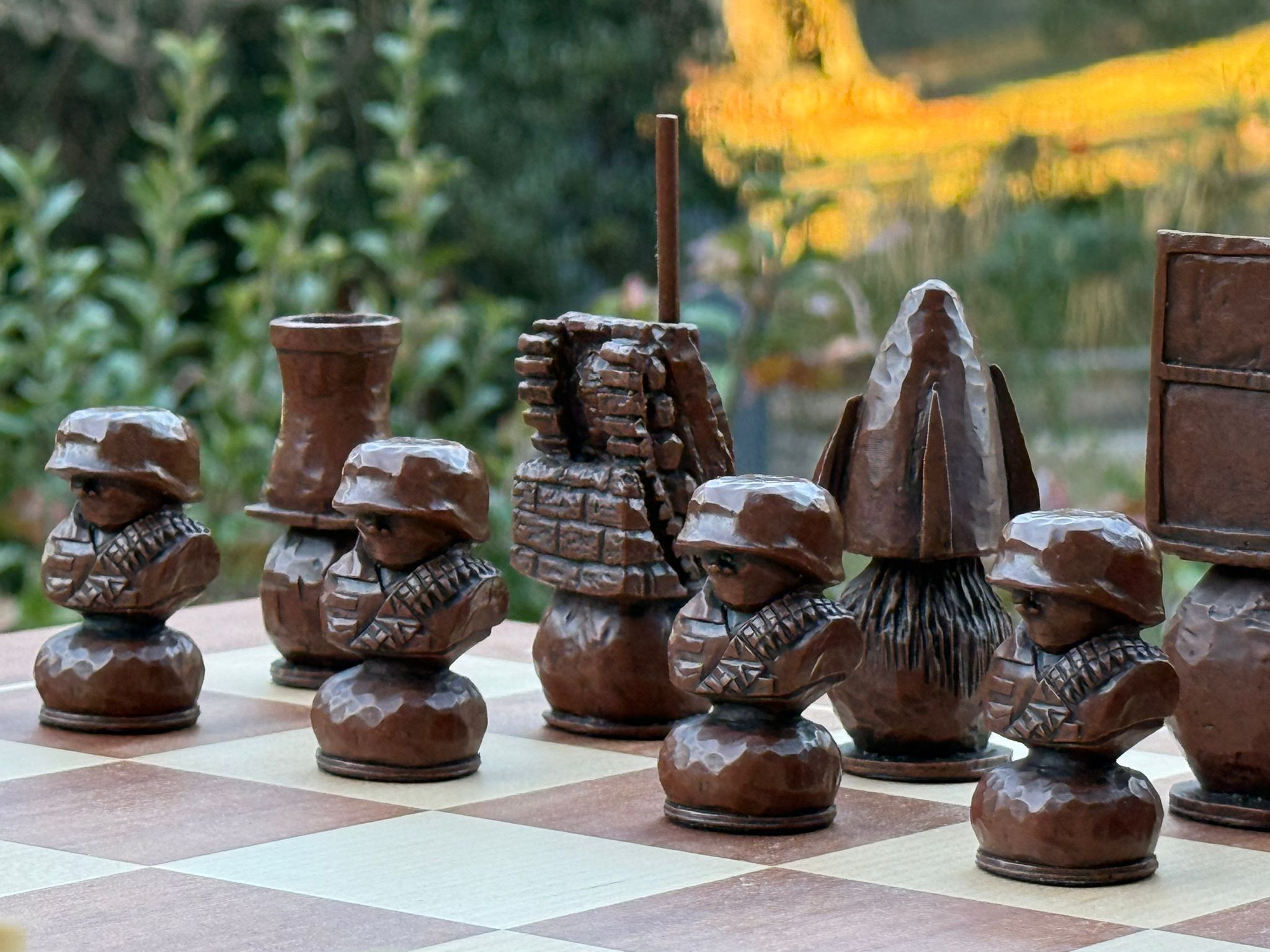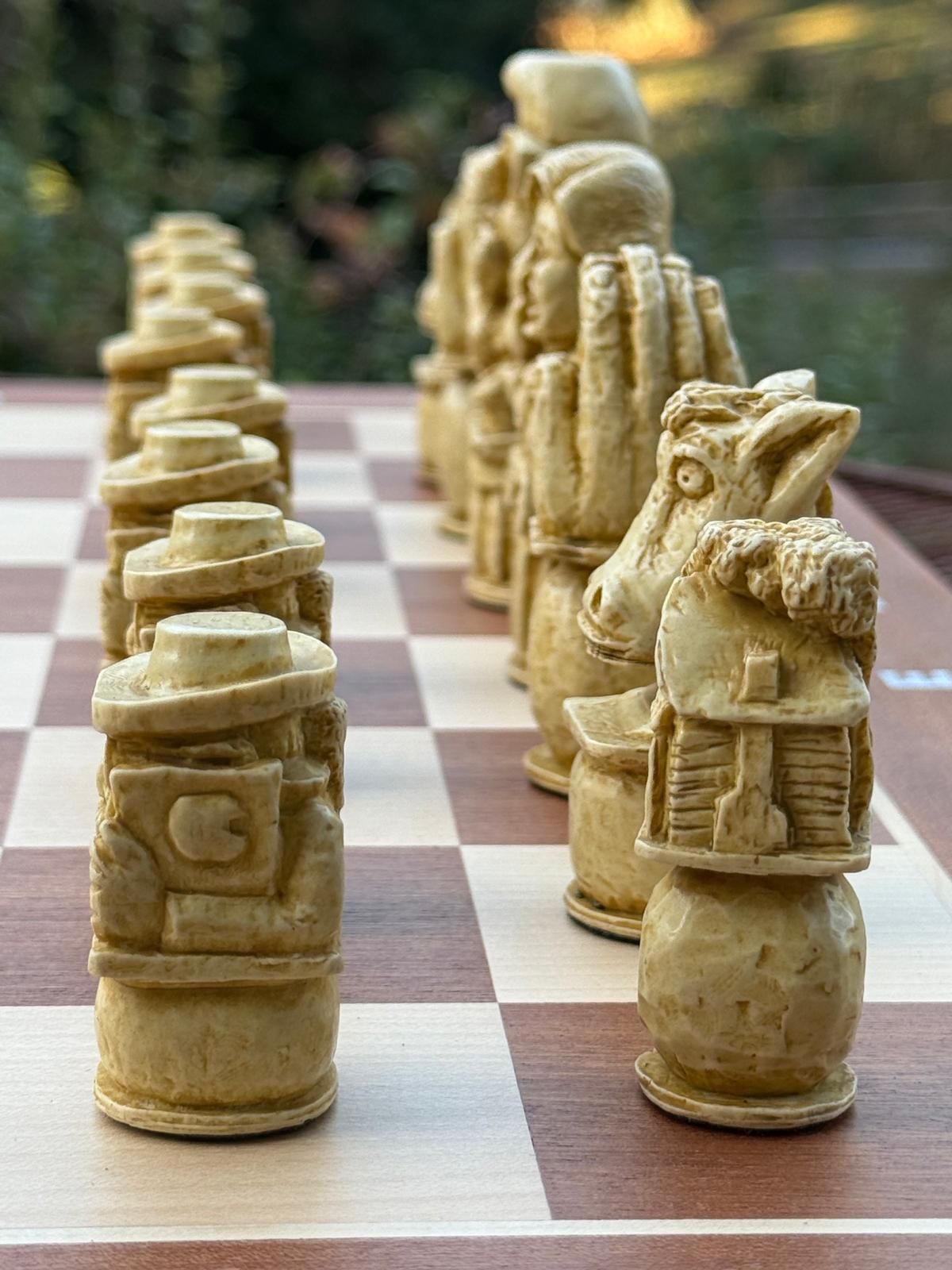 A set of stone and resin chess pieces depicting key US political characters, namely Mr Trump, Mr Clinton and Mrs Clinton, along with key supporting objects as described below. The set also has Bernie Sanders as an extra/alternative white King – it’s supplied by default.