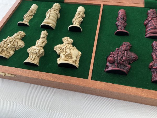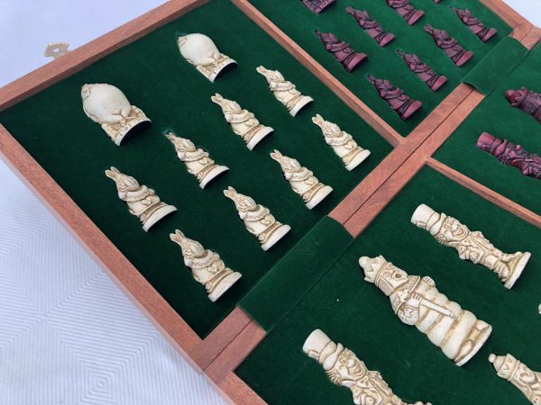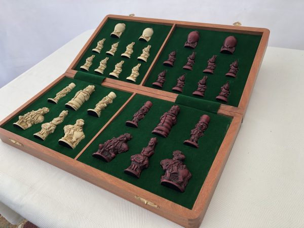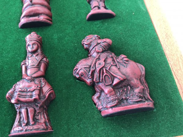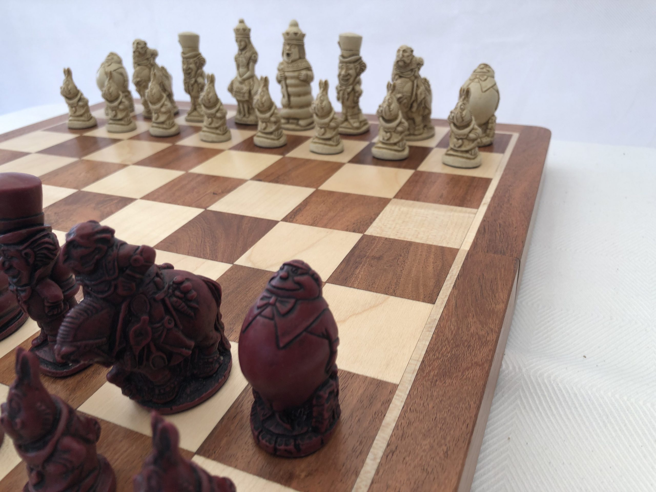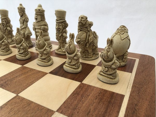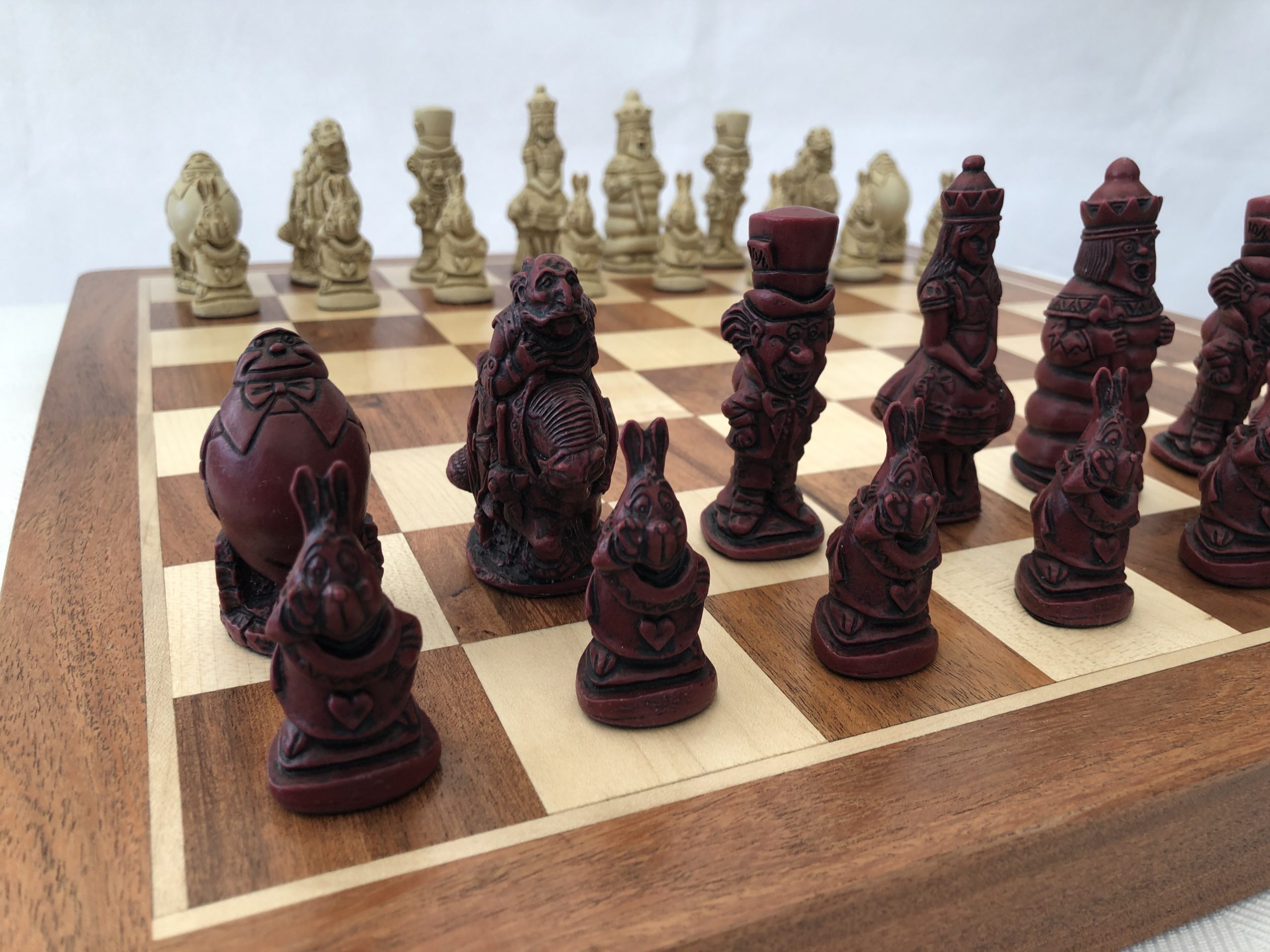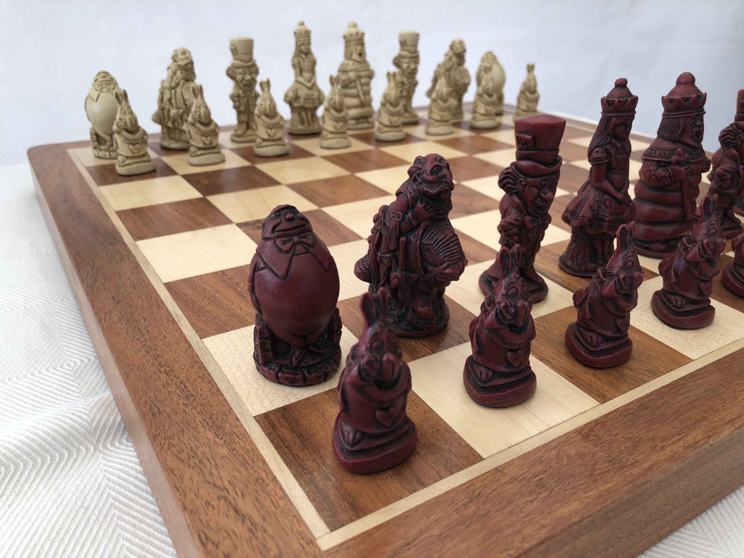 Made in England by Berkeley Chess Ltd. Superb combination of Alice in Wonderland Chess Set in classic Ivory and RED with bespoke solid wood case and board included. Berkeley Chess products have become the Gold standard in Theme chess quality. This Alice in Wonderland set is expertly made from crushed marble – they are well weighted and very detailed. The combined case and board has spaces for each individual piece and simply looks wonderful.