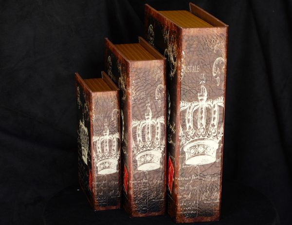 NEW ITEM! Don’t want an ugly storage box sitting around waiting for your next game of chess? Find a solution with these NEW Book Boxes with Crown! These boxes have a leather-like look, as if you’ve left an old book on the shelf or table. But look inside and voila! Enough room for all your chess pieces to live until the next battle! Fabric lined interior with faux binding on the outside. House your pieces in style! Great idea for gift giving too. Dark coloring. Medium accommodates our set pieces with up to 4.5 inch Kings.