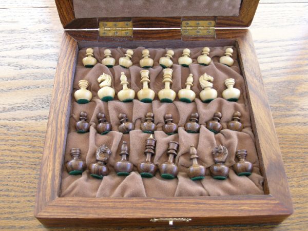 Constructed in Golden Rosewood, this set is so cute. The weebles wobble but don’t fall down. Every little piece can be made almost horizontal, but just springs back into place. The pieces are not magnetised, but their base weighting to facilitate the bounce-back makes it seem as if they are magnetic. The case is quite luxurious, with velvet lining for each of the cute little pieces. A lovely chess gift for someone.