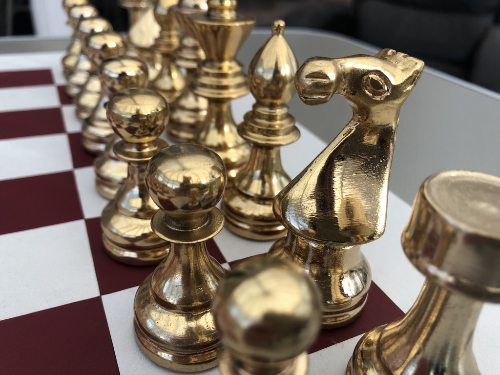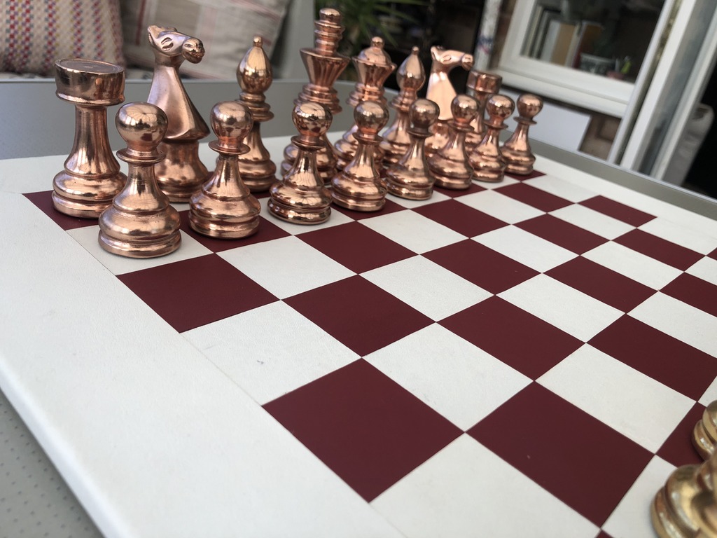 Delightful complete chess set mixing heavy solid metal chess set with a leather wrapped board measuring 16 inches (each square is 1.6 inches). A rustic product that is presented in a white leather case. This is a one-off, we only have one single set of this product.