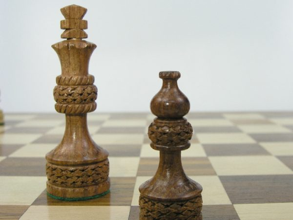 One of our special designs – at 44g for the King this represents a well weighted unusual set of chess pieces that has an ornate design. Weighting matters. Cheap sets fail to have good auxiliary weighting which results in a unsatisfactory playing experience because of pieces falling over – not so with this double weighted chess design. All that thought into strategy and the pieces get knocked and you can’t remember the positions (a handy technique of you are losing). This set of double weighted chess pieces are of high quality not just because of the weight but also through the extra detail in the pieces. The Staunton design is solidly retained but the ornate intricate detail gives these chess pieces a flavour rarely seen in Staunton circles. The board for this set should have 1.75 inch squares.