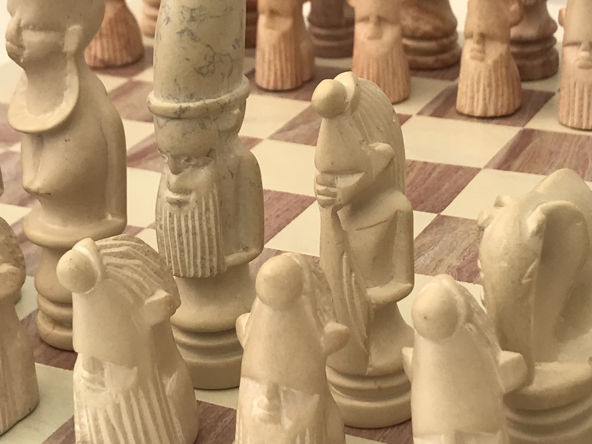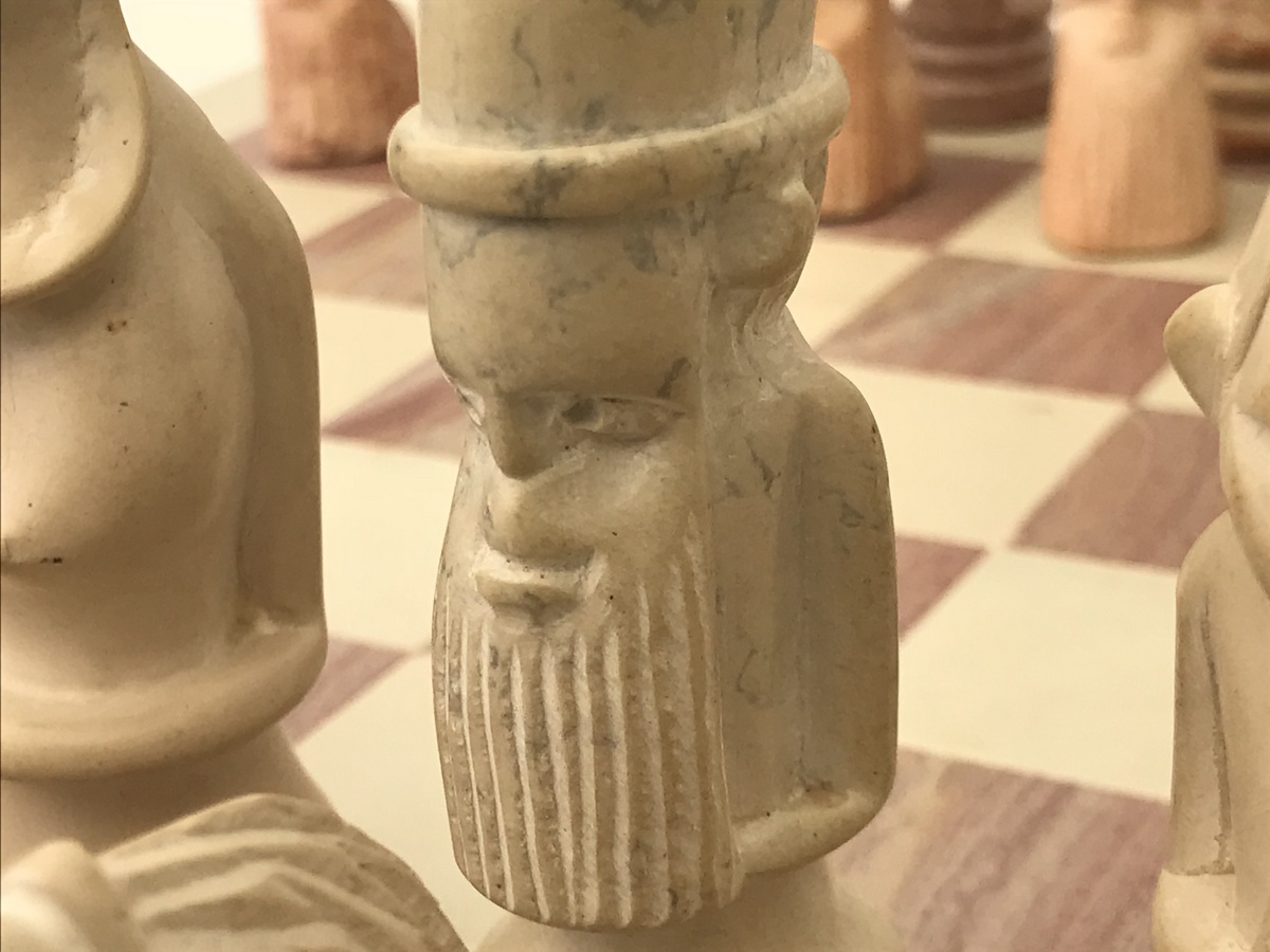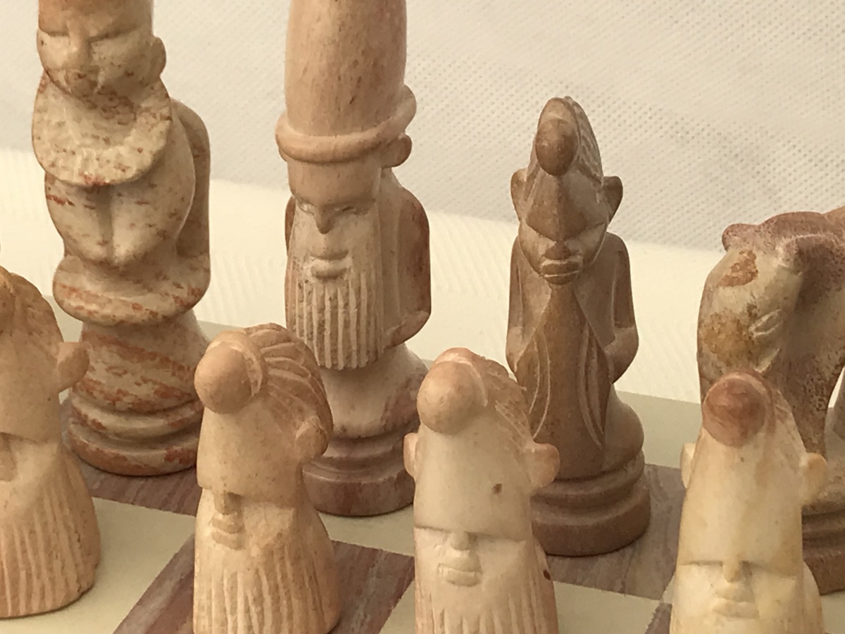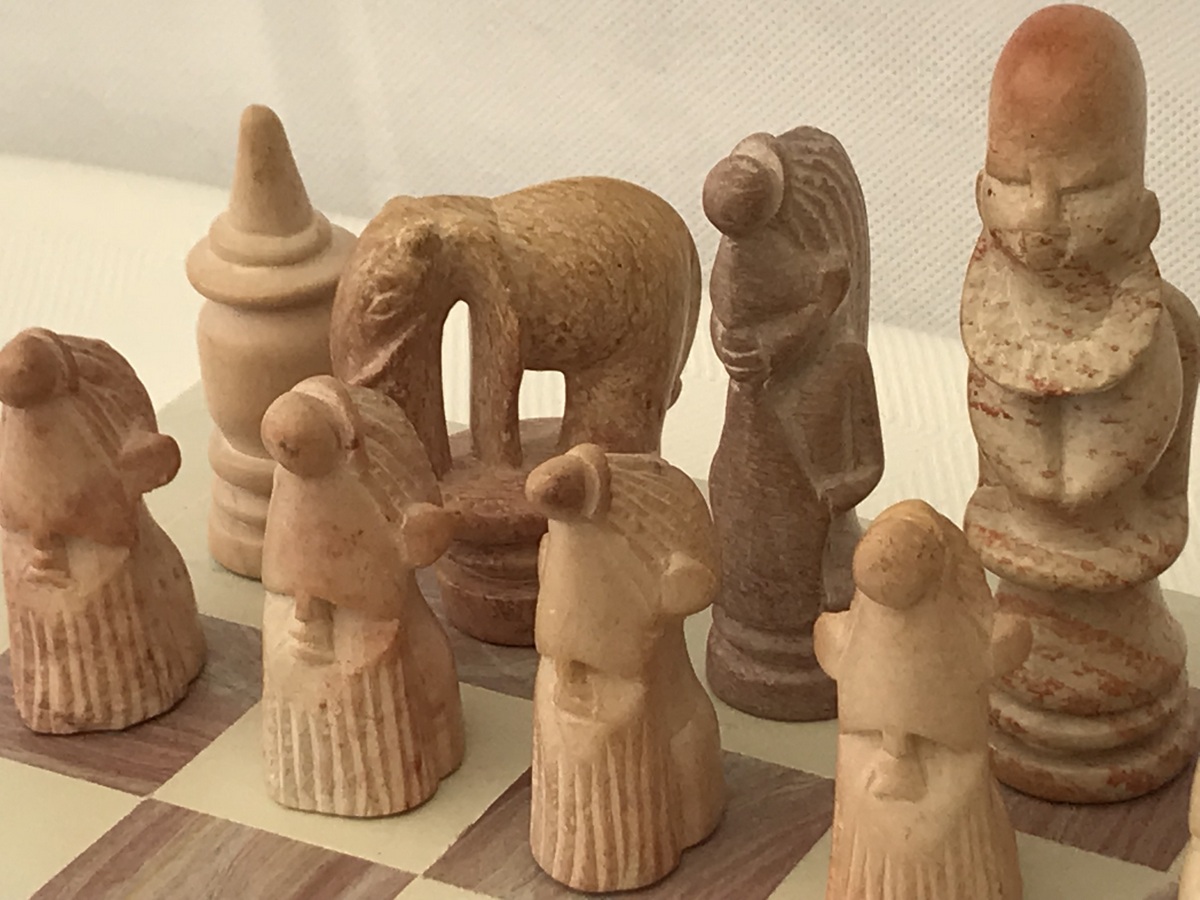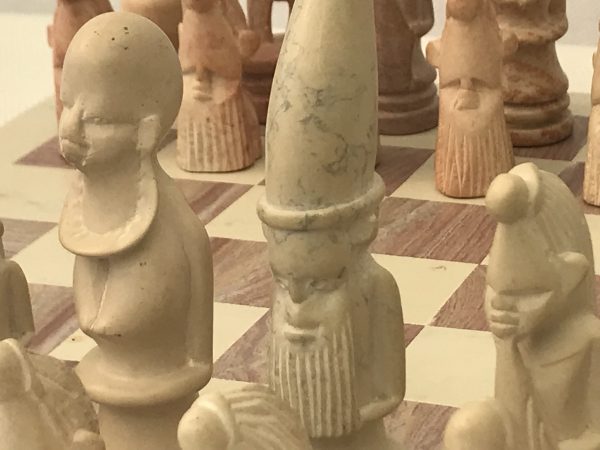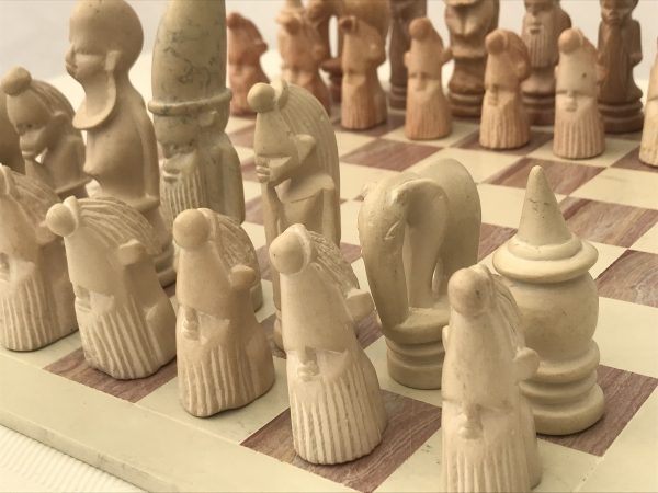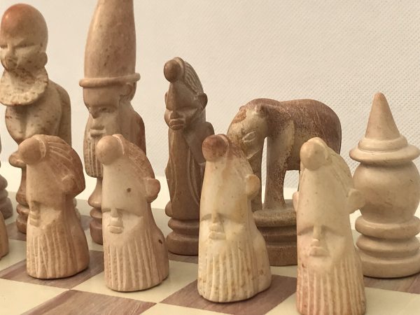 One-Off unusual African tribal heavy solid marble chess set with heavy matching marble chess board. The crafts person has brought out elements of character in detailing each piece – even every pawn. The set has atmosphere! Here’s an opportunity to own a chess set that is not mass produced, but is the only one in the world! Hand crafted and made in superb African marble. No more will be produced – it’s a genuine single product.