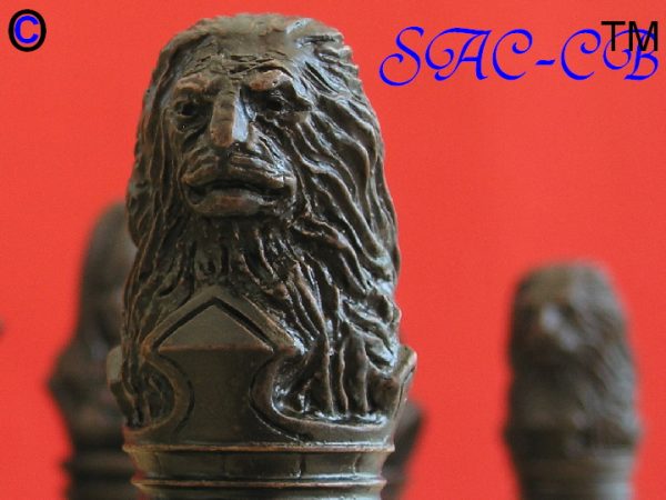 Very detailed unpainted theme chess set with figures defined as positions and personalities of Richard the Lionheart. Historical and very attractive, the set is a remarkable chess set to own and because of the commonality of som eof the positional figures, good for general chess playing too.
