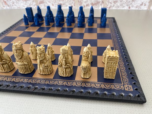 Delightful Isle in Lewis set in BLUE. A one-off product – the only product in the world in this colour with a matching blue chess board and containing case. The chess board / case is made in leatherette by the Italian chess masters Italfama. Each piece has it’s own place within the case / board, and is accompanied by draughts and Backgammon pieces too. The case / board width is 14″ and the King height is 2″. The chess pieces are made from crushed marble and bonded with resin. They appear as stone carved chess pieces.