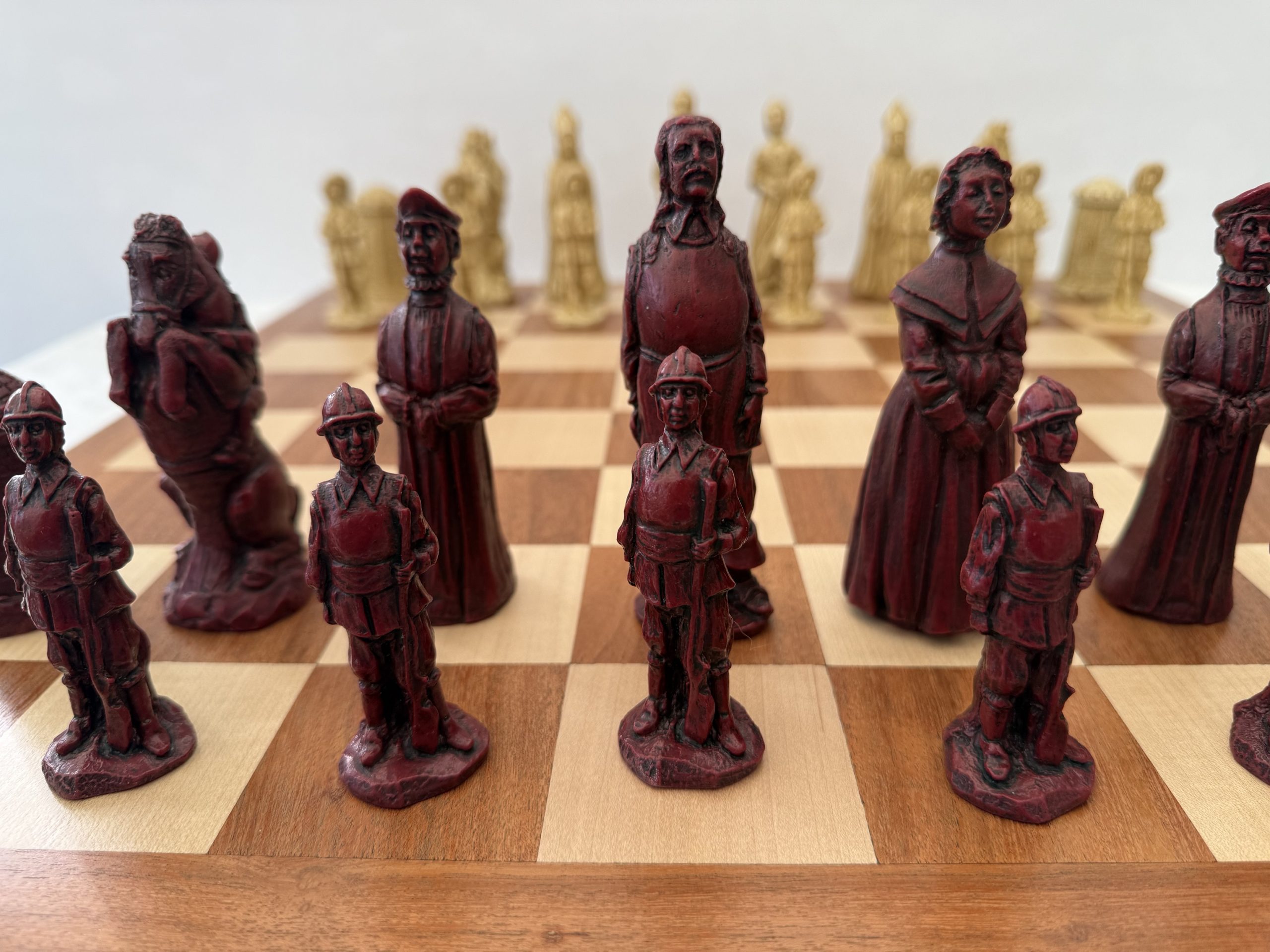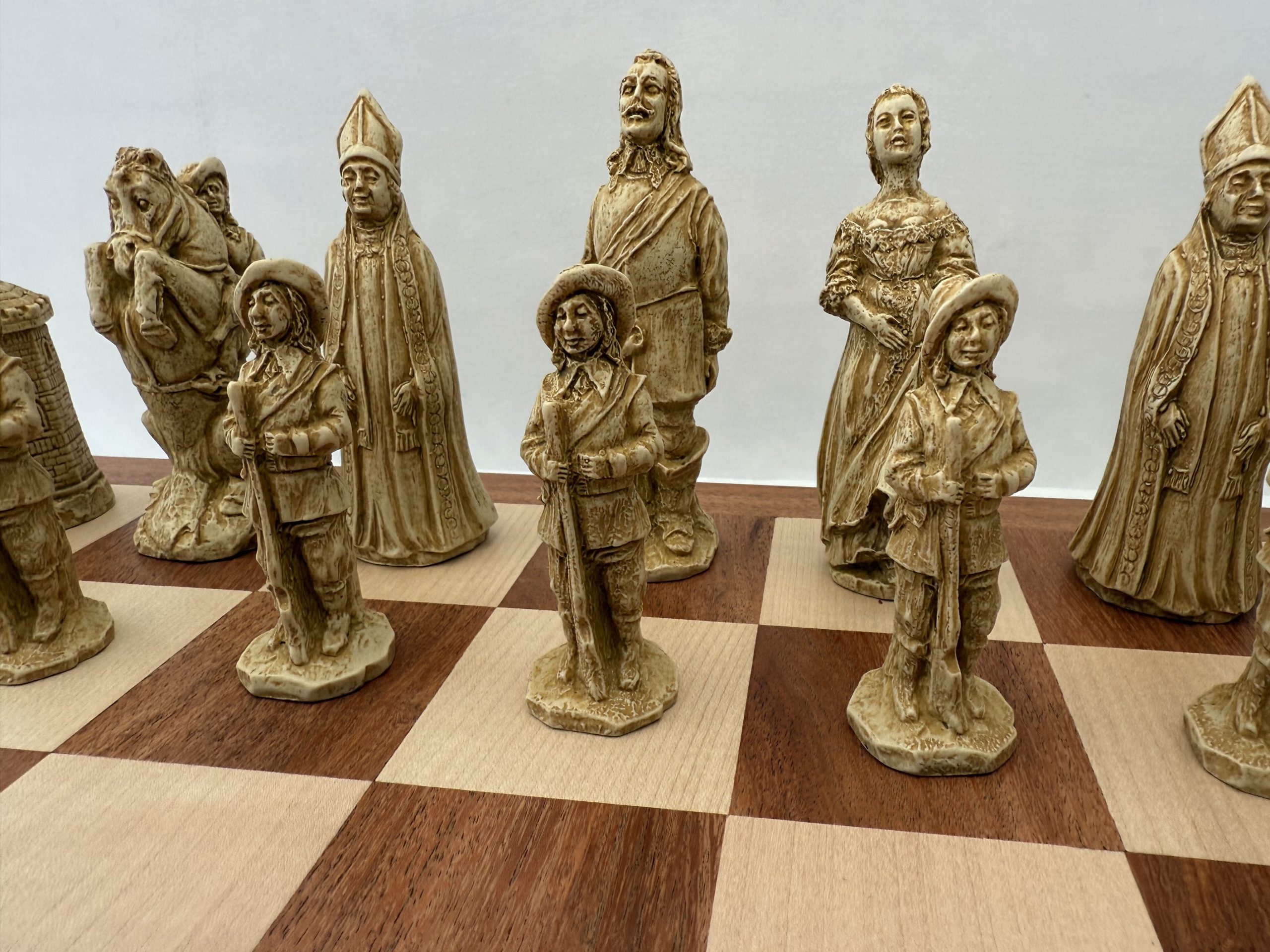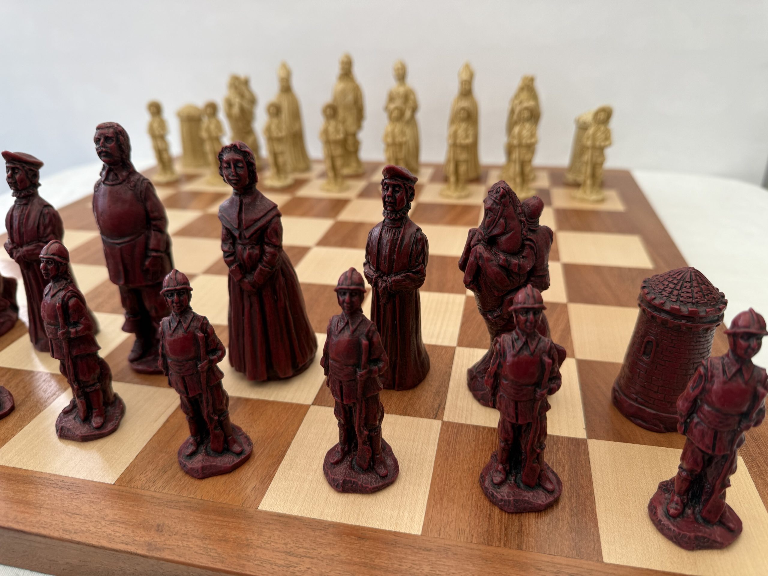 This Berkeley Chess Cavaliers vs Roundheads Chess Set brings the drama of the English Civil War of 1642-1651 to the board. Made in solid stone blended with resin, each piece has reassuring weight and detail. The white side represents the Cavaliers, loyal to the monarchy and known for elegant dress and plumed hats; the Red side portrays the Roundheads, the disciplined Parliamentarian forces recognised for their simpler armour and plain attire. The King stands 4 inches tall, giving the set presence without overwhelming your board.