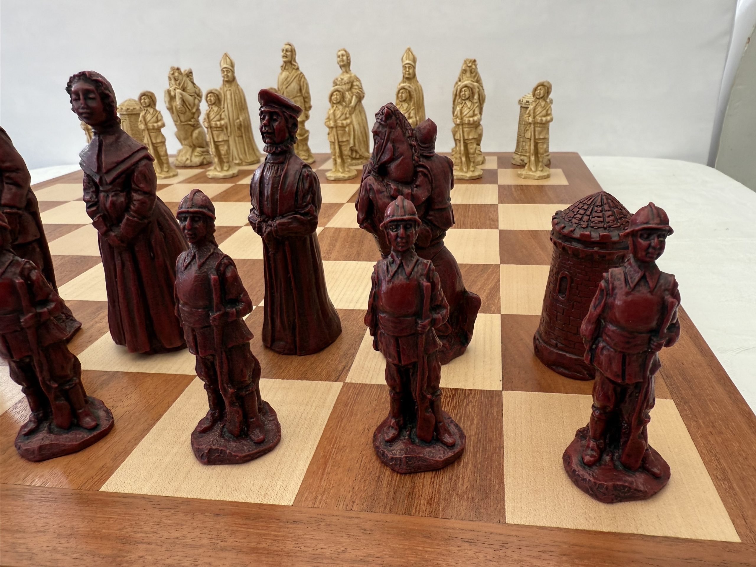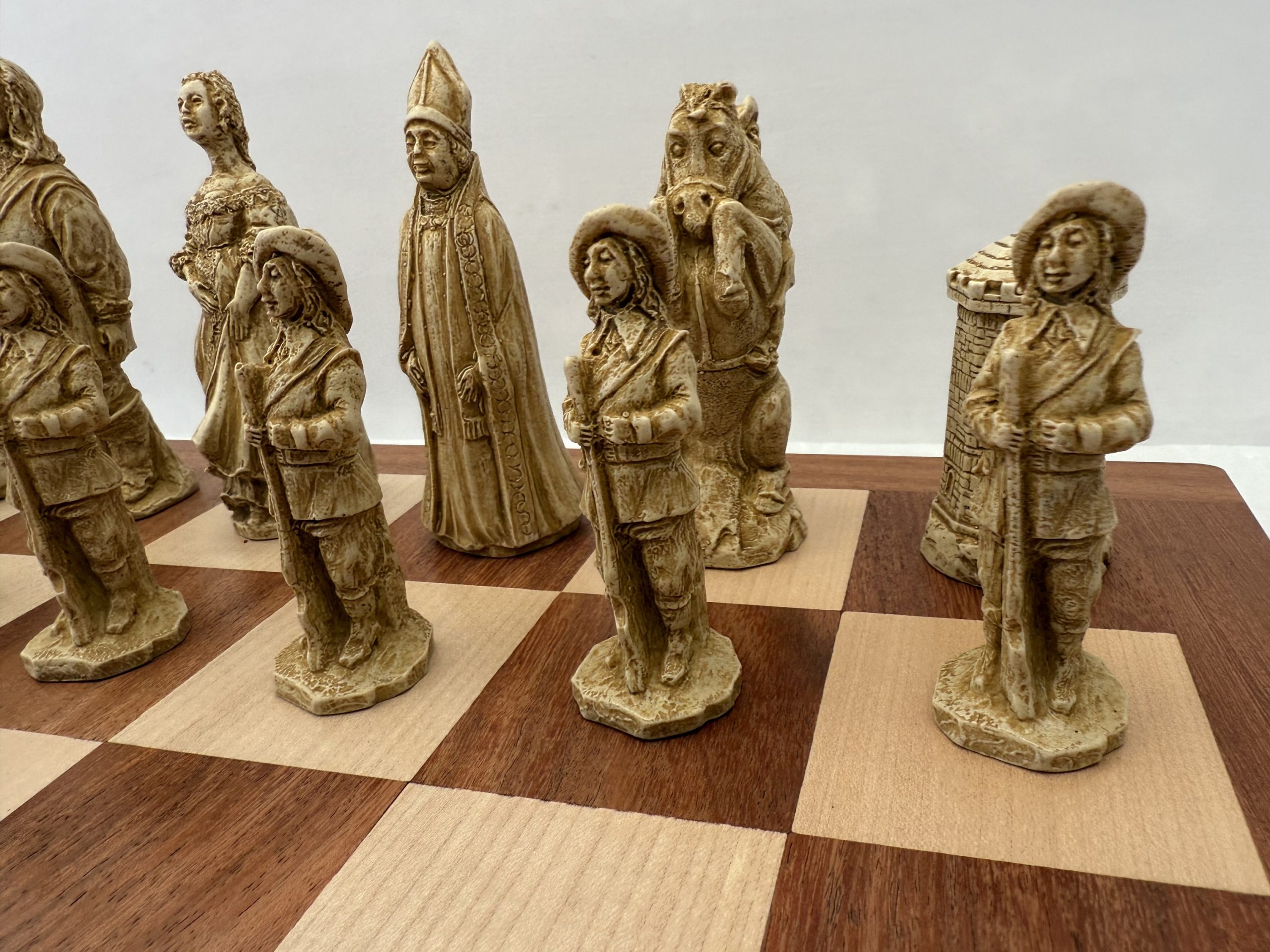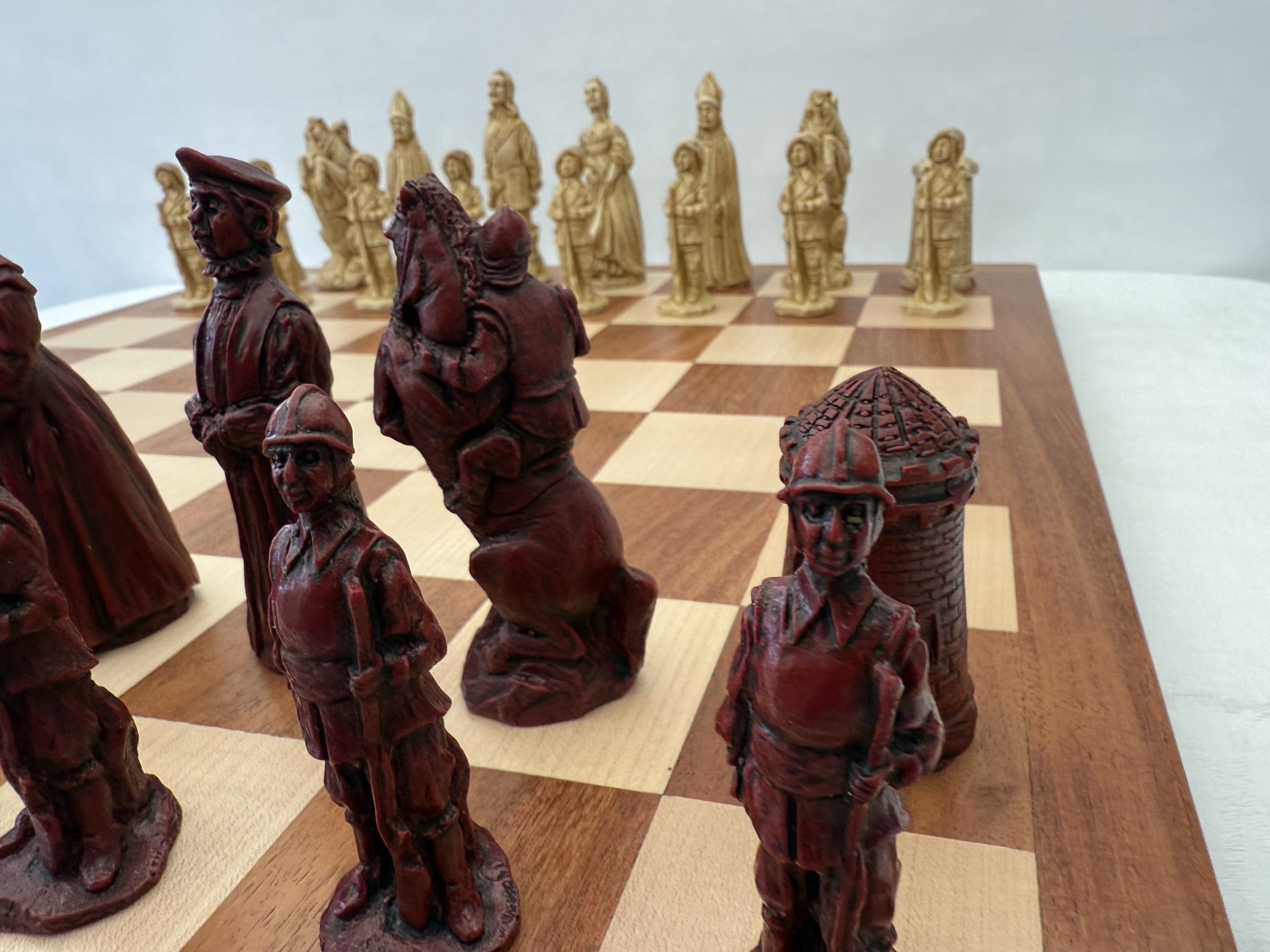 This Berkeley Chess Cavaliers vs Roundheads Chess Set brings the drama of the English Civil War of 1642-1651 to the board. Made in solid stone blended with resin, each piece has reassuring weight and detail. The white side represents the Cavaliers, loyal to the monarchy and known for elegant dress and plumed hats; the Red side portrays the Roundheads, the disciplined Parliamentarian forces recognised for their simpler armour and plain attire. The King stands 4 inches tall, giving the set presence without overwhelming your board.