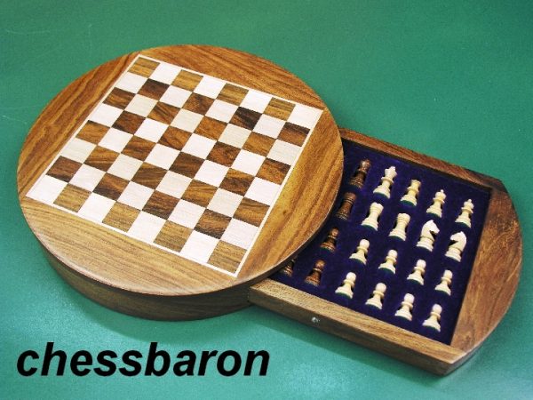 This product from Chess Baron: Round version of the above magnetic chess set. A drawer with ballbearing inset to hold it in is inset holding the pieces in individual indentations, beautiful as a gift and beatiful as a high quality travel chess set.