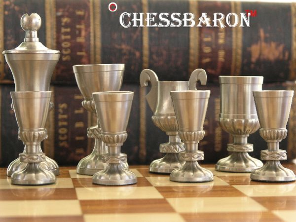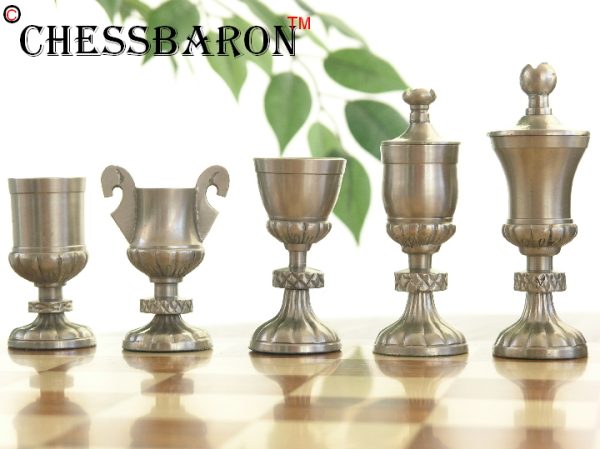 New! Looking for something distinctive that really makes a individual statement? Here’s a very heavy metal chess set that really stands out. Modelled from archeological finds, the Judean historian Josephus had a collection of goblets that this set is modelled after – perfect material for a chess set because of the variety in design making up the different pieces. Unusually the King and Queen pieces both have unscrewable caps. The set also trumps any other shot glass chess set we’ve ever seen. This is a shot glass chess set with distinction – and is obviously not glass – it’s made in copper and steel. A great chess set!