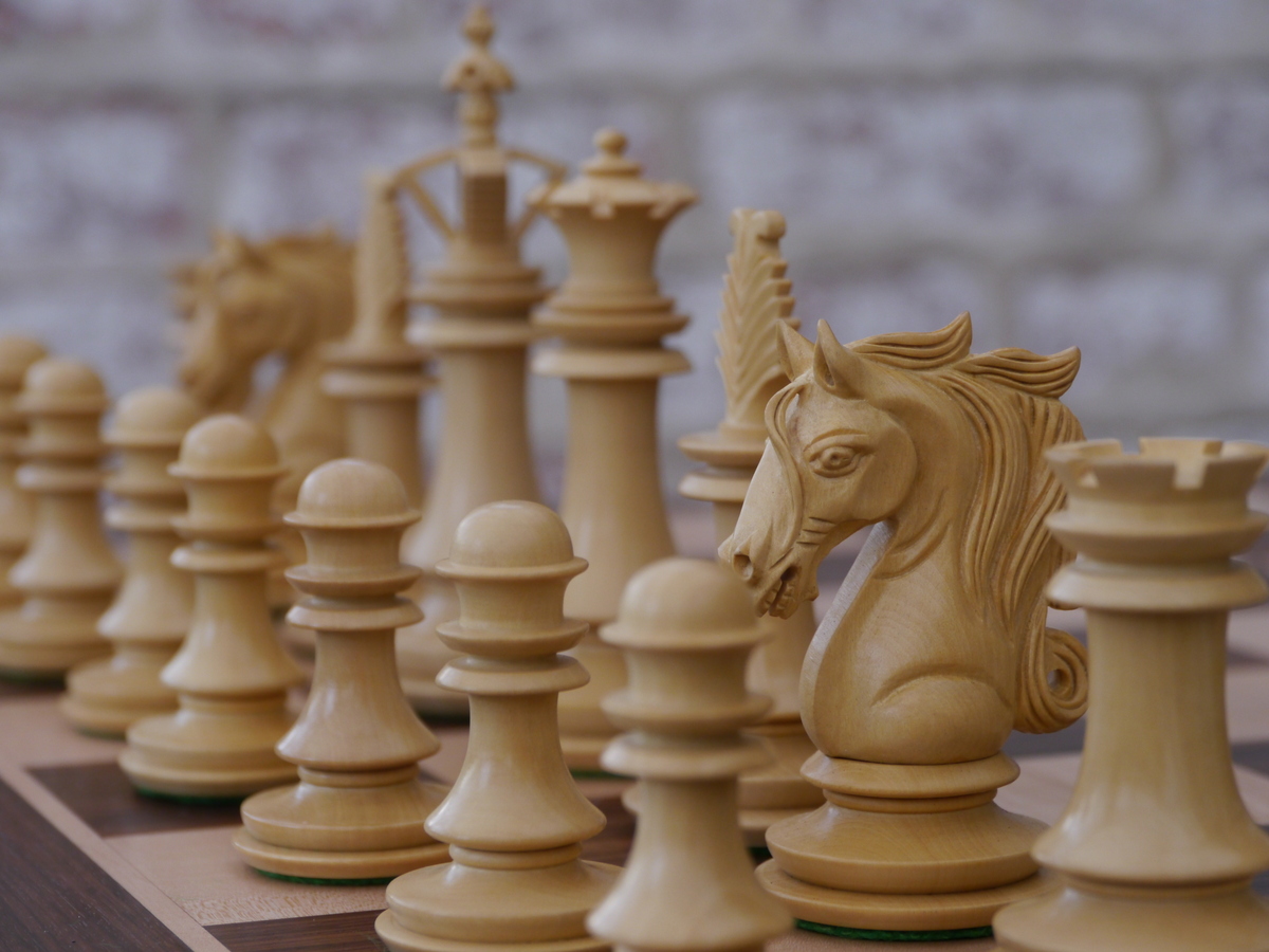 NEW! A dramatic and bold strike at a staunton chess design in Bud Rosewood using light and space that may be the best we’ve ever seen. A beautiful knight with superb detail and flair of expression. Parts of the horses mane straying over the face have a distinctly Italian flavor. See the pawns – what a bold style! This is a unique and outstanding design. But now, let’s come to the King design. Playing with light and space to give us a Louvre-like feel. Choose a large board with at least 2″ squares. Wow! Double Queens of course.